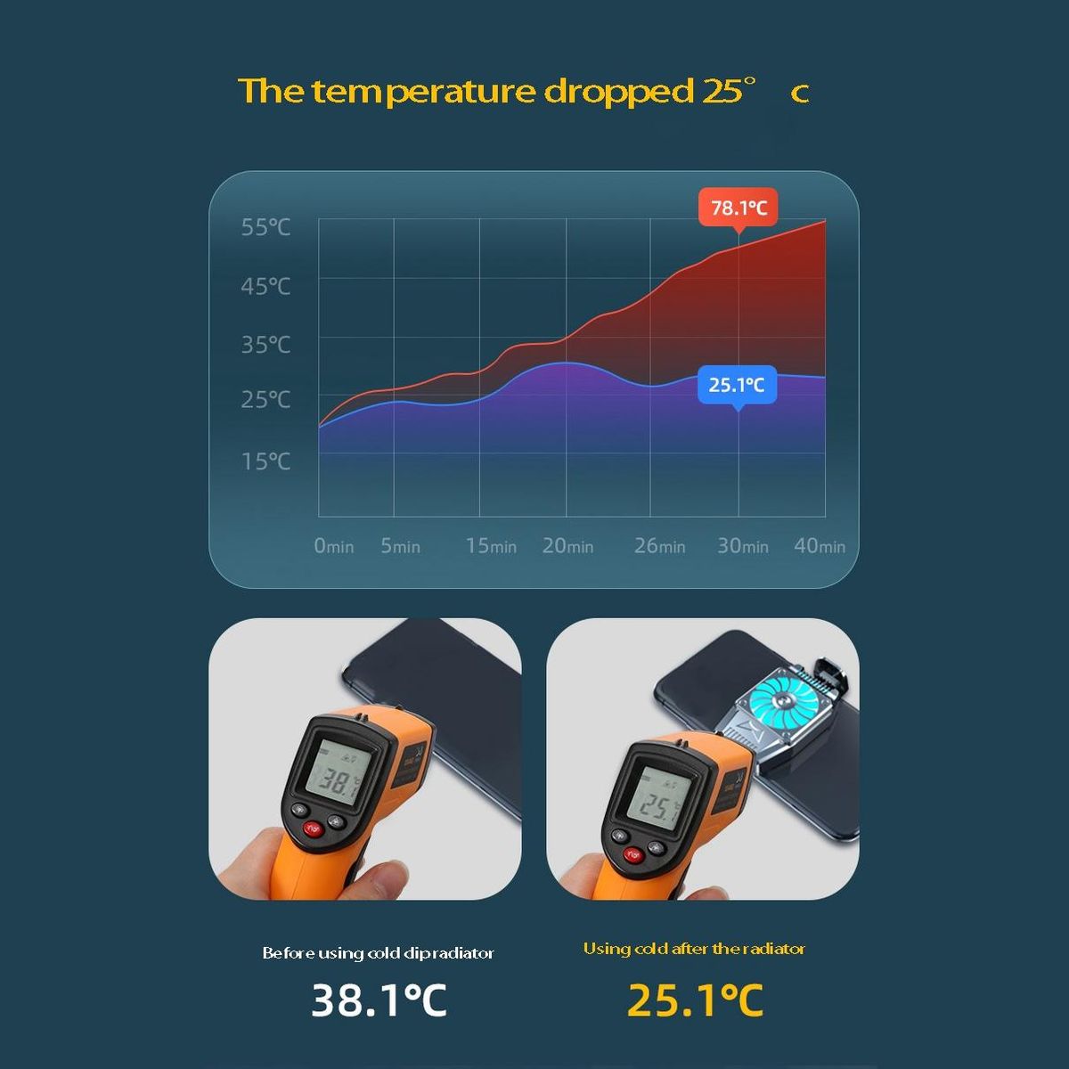 [3 seconds cooling phone radiator]: mobile phone radiator use a semiconductor cooling elements, which can reduce the CPU temperature to about 15°C in 3 seconds. The built-in high-speed gear with 5000 rpm and semiconductor heat dissipation method can quickly cool down the smartphone, reduce CPU consumption, solve the situation of cell phone crash or automatic shutdown due to excessive power, and can also extend battery life. It can satisfy the cooling fantasies of all players.