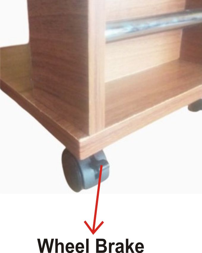 The main material of construction is engineered hardwood while the braces or supports are shining, hollow stainless steel rods. Of the four caster wheels that make it easy to move around, two are lockable. Lock one or two wheels and it stays stationary.