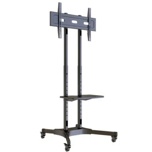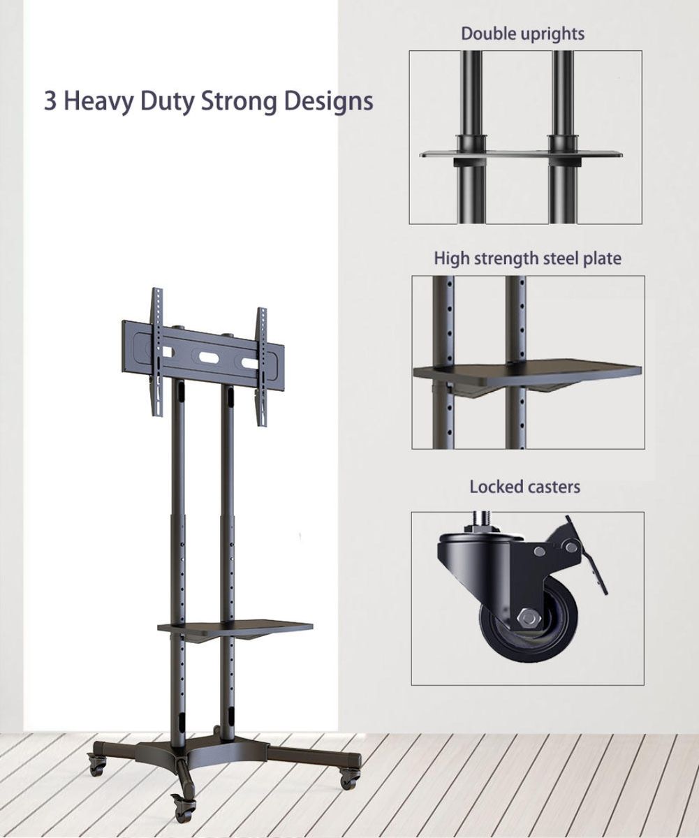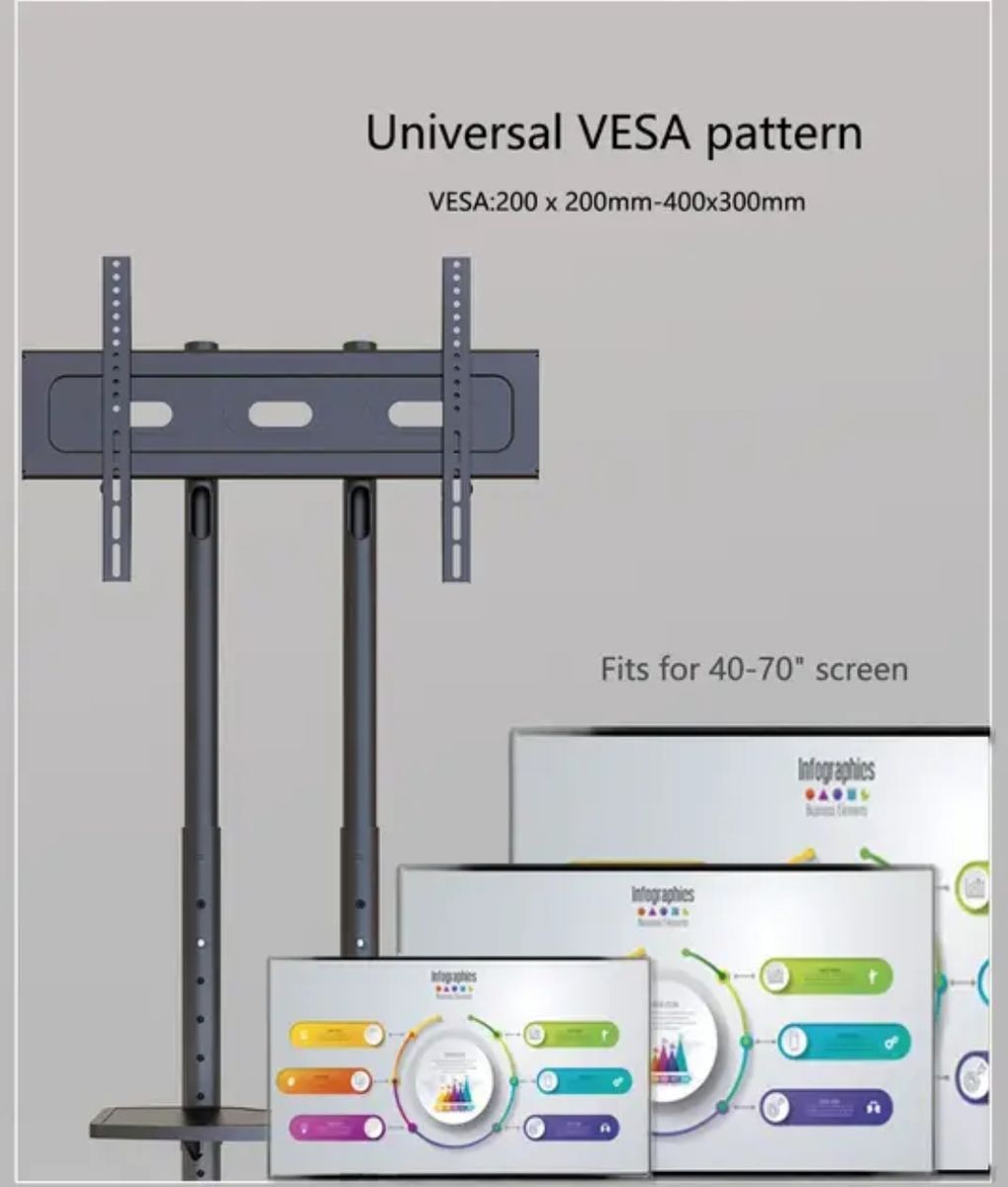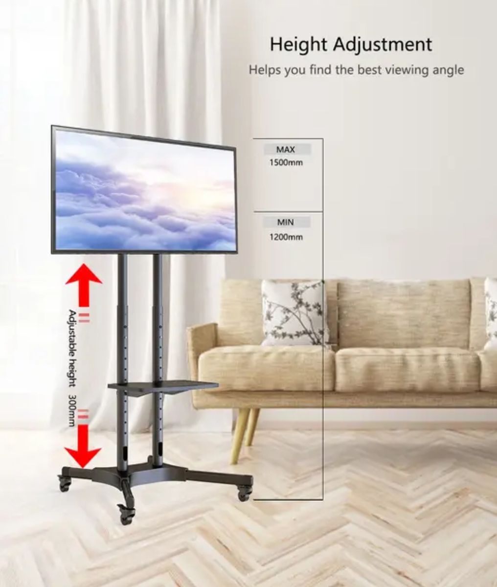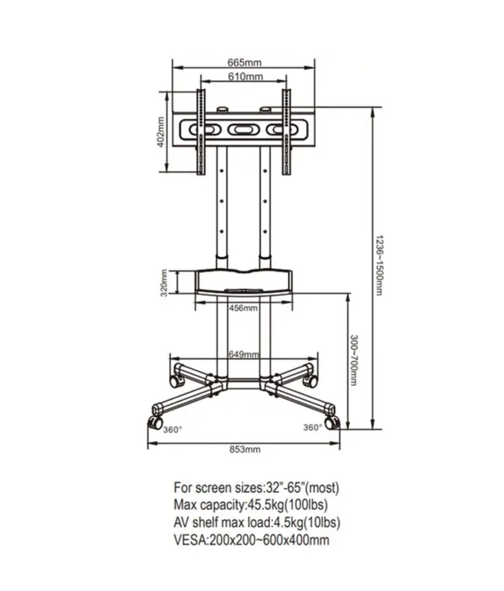 * UNIVERSAL TV CART ON WHEELS: mobile TV cart fits most 32" to 55" plasma, LCD, LED, flat screen and curved TVs weighing upto 55 lbs. This rolling TV cart fits VESA 200x200, 300x200, 300x300, 400x300, 400X400; 600X400* HEIGHT ADJUSTABLE TRAY: comes with a sturdy media shelf to hold your laptop, DVD player or gaming devices. Distance from thefloor to the AV shelf is from 12" to 24". The wall mount plate can also be adjusted and you can easily choose the height youprefer to customize your viewing experience* HIGHLY COMPATIBLE: convenient for moving your TV around at home or in the office, our TV stand meets your different needs.Effortlessly move your TV from the living room to the bedroom. Perfect for commercial use in shopping malls, offices,conference rooms, trade shows, hotels and more