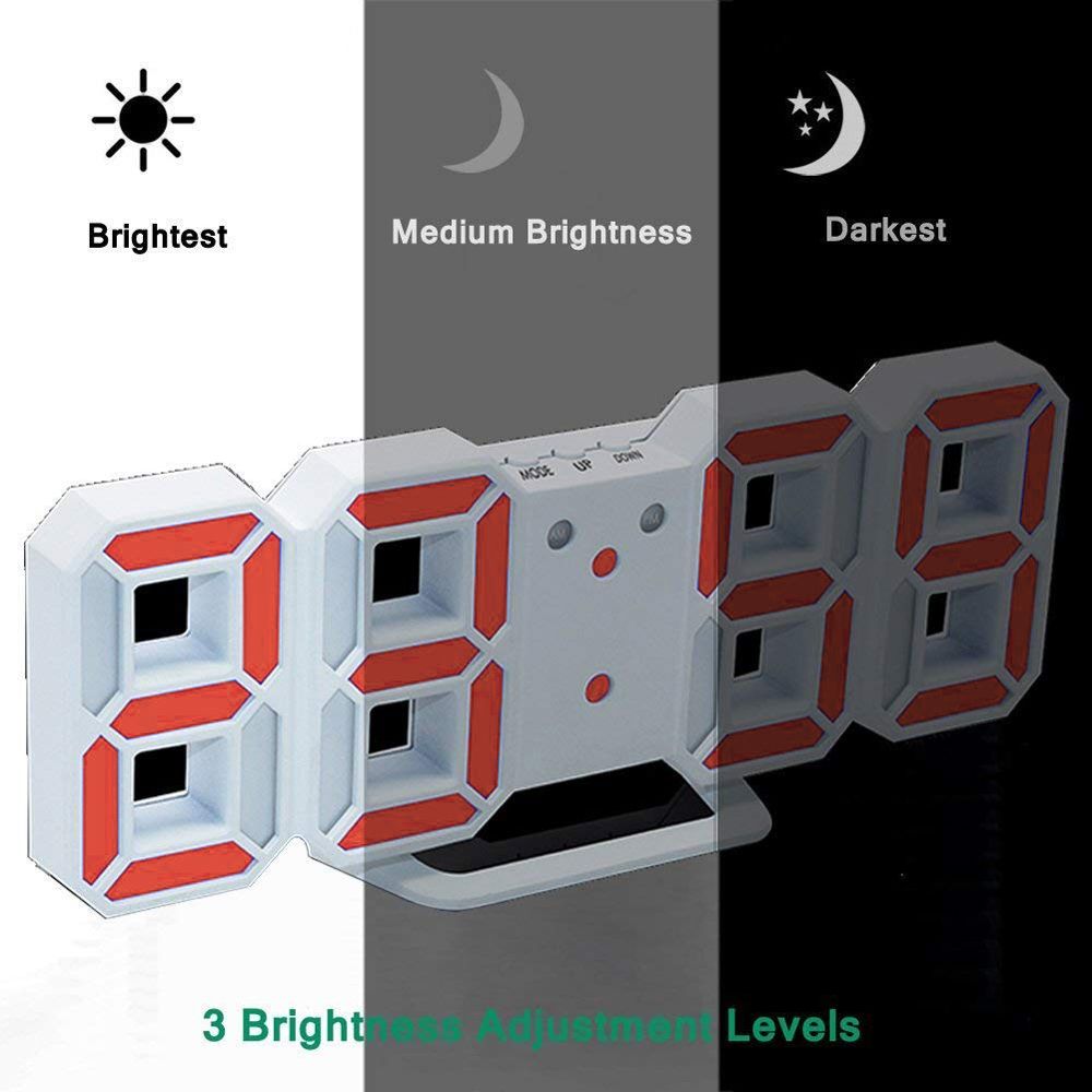A fashionable and easy-to-read clock with large LED “8888” digit display, Blue LED lights.A lightweight and concise space clock that easy to place anywhere in your room.Dimmer function: 3 adjustable luminance levels (High, Medium and Low level).12/24h Time format: The PM indicator will light up in 12h time format.Alarm function: 0-24h alarm clock with 2 minutes beeper;Snooze function: you can take a nap for a little while. The default snooze time is 5min, and can be freely set from 5 to 60min.Night mode function: auto lower the LED luminance during the night time. The default night period is 18:00 to 6:00 and can be adjust freely.Convenient to place anywhere: stand and wall mount hole design.USB powered and battery backup: power by USB cable and button cell battery for back-up function.