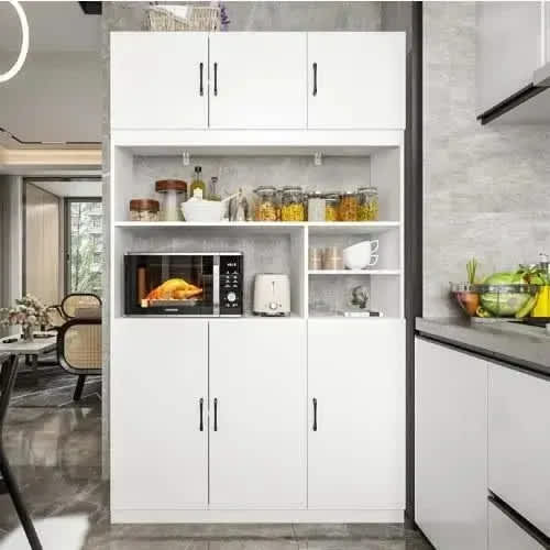 Weight 56.00 kgColour WhiteYou'll love this white kitchen pantry for its closed cabinets and ample storage design with a countertop. You can use this storage cabinet as a kitchen sideboard buffet sideboard, home storage cabinet or coffee bar cabinet. 4 cabinets provide ample storage space to keep your coffee mugs, jars or bowls organized. Made of medium Density Fibre Board board with reinforced back panel and wall attachments for added stability and safety.Durable, moisture and scratch resistant, and very easy to cleanThe kitchen pantry has plenty of storage space to expand your storage spaceComes with 4 cabinets, spacious table top and open storage shelves. This kitchen pantry will provide you with a variety of storage needs.Also works as a microwave rack. Open shelves and countertops are perfect for displaying and storing everyday essentials.Colour:WhiteShelves Included:YesNumber of Shelves:12Doors Included:Yes Drawers Included:NoMicrowave Shelf:YesWeight Capacity:45kg DIMENSIONL - 5 FEETD - 18 INCHESH - 7 FEET