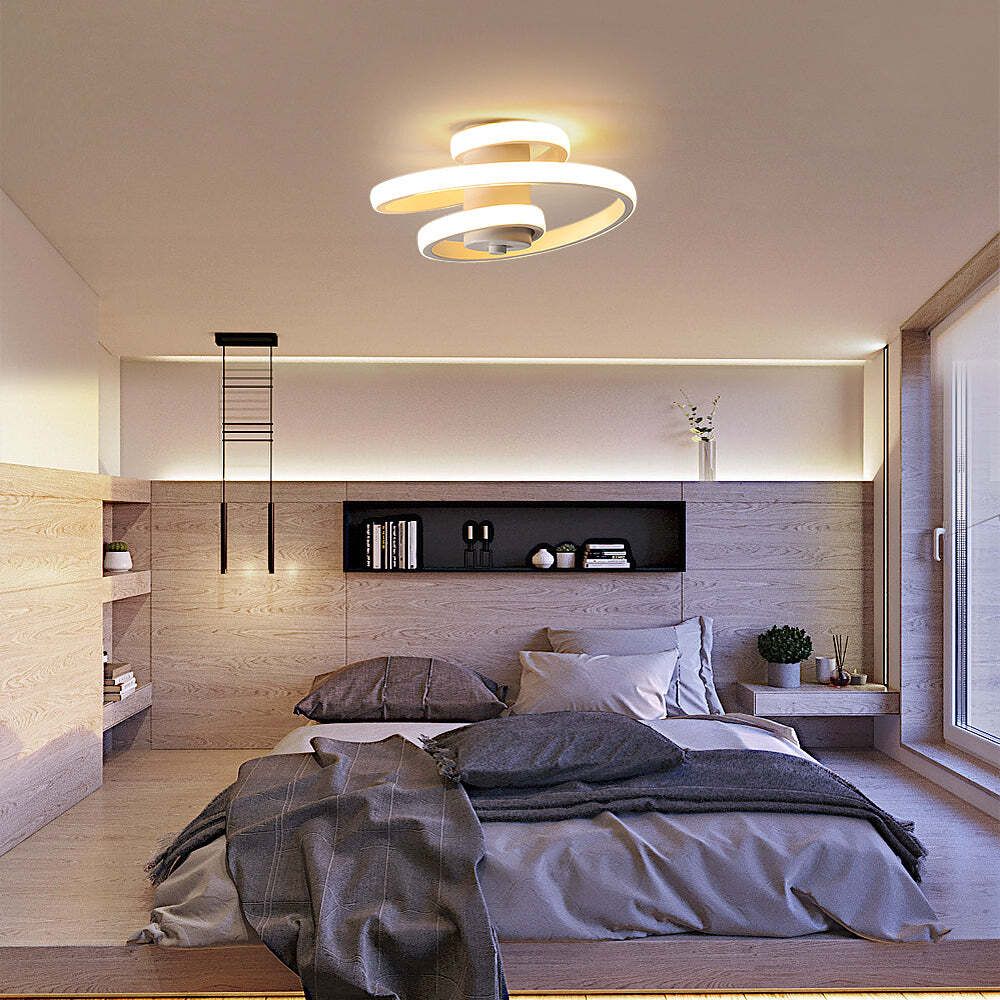3500K.WIDE RANGE OF APPLICATIONS: This simple LED ceiling light is suitable for rooms with modern decoration style, such as bedroom, study, living room, dining room, hallway, porch, office, etc. The unique spiral design can not only light up your room, but also Decorate your room. Warm white light creates a warm and comfortable atmosphere and makes you feel more relaxed (recommended room area: 5m²-10m²).ENERGY SAVING: The warm white ceiling light uses LED light source, compared with traditional bulbs, LED lights are more energy efficient, consume less power and have a long service life.MATERIAL: Modern ceiling lights use metal base and acrylic shade, which is fade resistant, easy to clean, and has high light transmittance and high heat dissipation.EASY TO INSTALL: This spiral LED ceiling light has a simple structure and is easy to install (The package contains the necessary screws). There is a LED driver in the ceiling lamp body, the interface has been processed. You can install it by drilling two holes in the ceiling with an electric drill.Acrylic lampshade