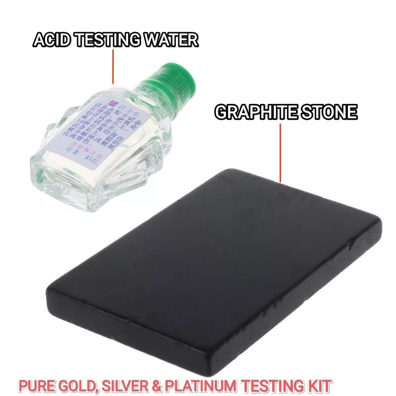 If you want test if your gold Jewelries is real or not, you just need to scratch it a little on the black stone leaving a small sample(colour mark) on stone, Then you Apply a drop acid (the Chemical in the transparent bottle) test on stone and leave for 1 minute. Real gold will stay on the touchstone, false one will be dissolved.