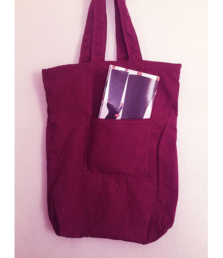 Detail(s): magenta color tote bag with design on one side and side pocket on the other side