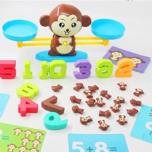 - KID + FAMILY FUN: This 65-piece toy set includes: 19 monkeys, numbers 1–10, 30 double-sided cards, monkey scale, base, 2 scale pans and an easy-to-read instruction leaflet.