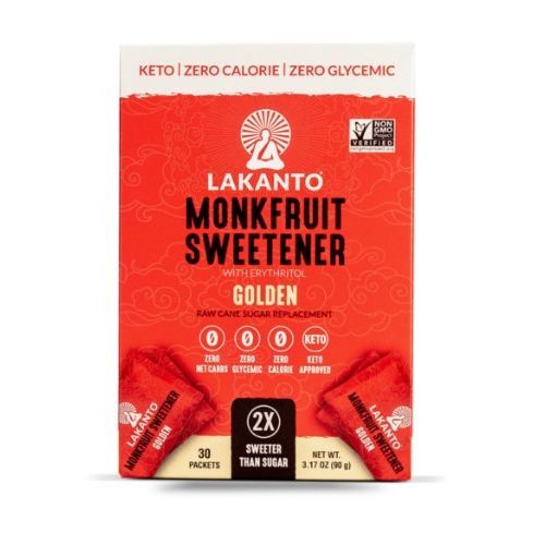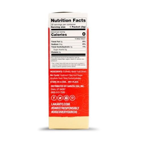 Product description Made from nature. With erythritol. Zero calories. Zero GI: Zero glycemic. Non GMO. Zero additives. Vegan. Gluten free. Zero aftertaste. 30 stick packs. Cooks, bakes and tastes like sugar. Over a Thousand Years Ago: In the remote mountain highlands of Asia, a group of Buddhist monks called the Luohan achieved enlightenment and ascension through meditation, prayer and pure living. On the slopes of a primeval forest, the monks discovered and cultivated a rare fruit prized for its sweetness. This sacred fruit was named Monk fruit, or Luohan Guo, after its devoted caretakers and was used in elixirs to raise chi, or life energy. Monk fruit was used for centuries in eastern traditional herbalism to increase chi and well-being, earning it the nickname The Immortals' Fruit. We still grow and harvest Monk fruit for Lakanto in the same pristine area and according to traditional and environmental methods. Born from a proprietary mixture of the high-purity Monk fruit extract and non GMO erythritol, Lakanto is a delicious zero calorie, zero glycemic sweetener with the sumptuous rich taste of sugar. American Masters of Taste: Gold. Superior taste. Erythritol is a naturally occurring sugar alcohol found in some fruits and vegetables. Packaged in the USA