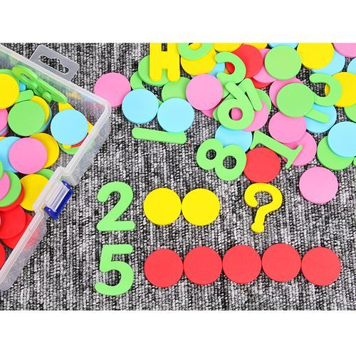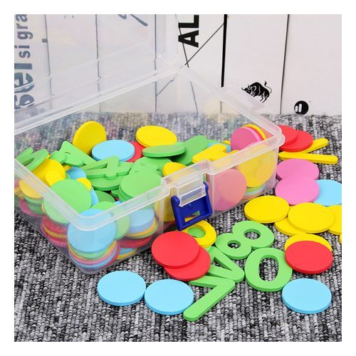One plastic box containing calculation counting color discs,numbers and arithmetic symbols