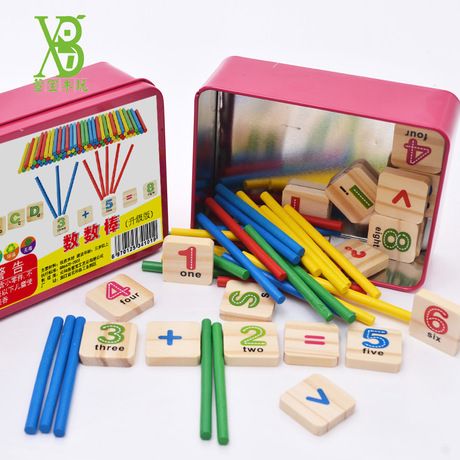 Each package includes: 1box with 52 colored non toxic oil painted wooden counting sticks 26 alphabet letters 6 arithmetic symbols:=,+,÷,×,-,>,