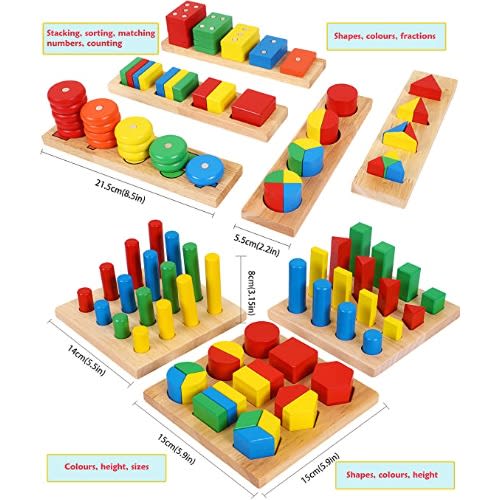 Ultimate wooden stacking sorting and learning toy - this wooden geometry shape sorting educational toy comes with 8 sets of the most popular early learning toys including sorting and stacking set of geometry shapes, stacking rings and fractions boardsStacking rings (colour, number and thickness sorting or fractions), shape stacking (sorting and stacking by shapes and colours), height sorting board (sorting colour and height), triangle fractions (colour and fractions), disk fractions (colour and fractions), square fractions (colour and fraction) and shapes colours and sizes sorting boardThe Geometric math set toy is great tool for children to learn colours, sizes, shapes, counting, division, fraction and sums etc. A useful tool to use at home or in the class room. Great value for money for endless learning, a fantastic educational toys and montessori toys for kidsThe amazing teaching tool is suitable for 3 years plus. To challenge the 4 5 6 year old school children, you can mix all the wooden shape blocks and rings together and ask the children to put the right shape and size to the right slot and pegs in the wooden boards! It is always advisable that an adult to supervise and enjoy the interaction of children with this toySafe and Environmentally Friendly: Toy safety and children's happiness are our top priorities. We make our wooden toys with pure love and care for our children and the environment.