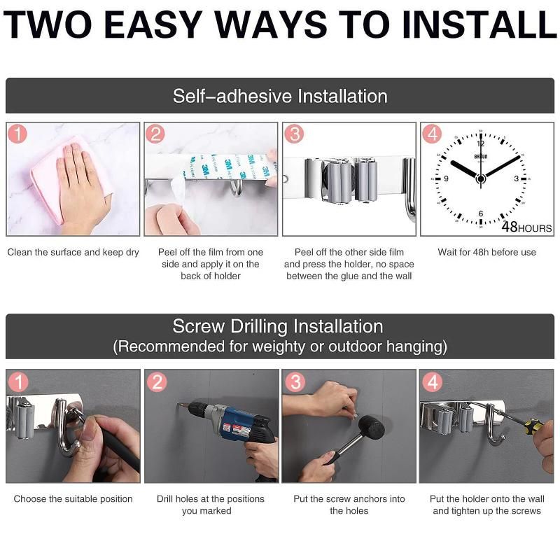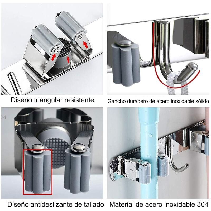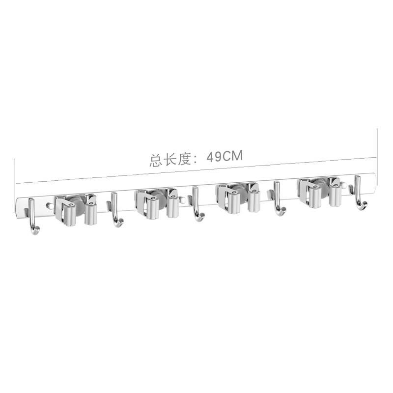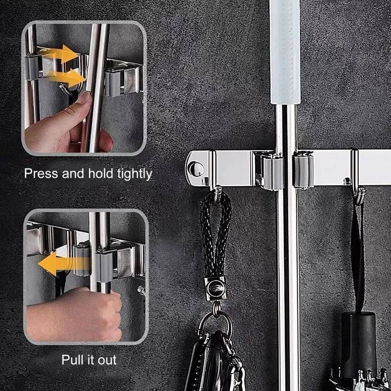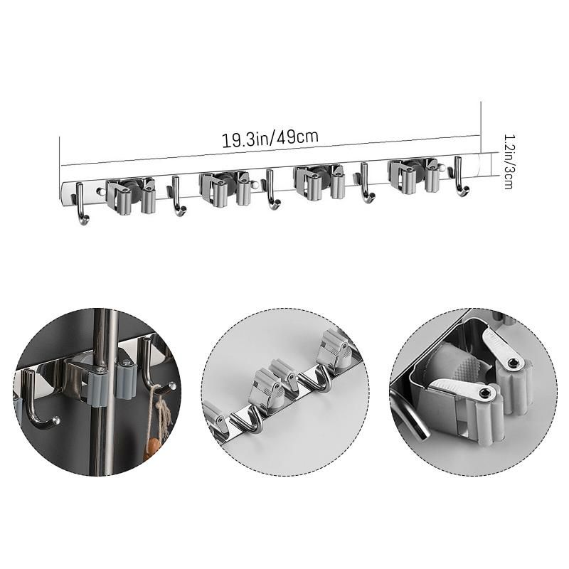- This broom holder with 4 clamps and 5 utility hooks. Not only keep the kitchen, home, garage more organized, but also save space, make it more tidy.