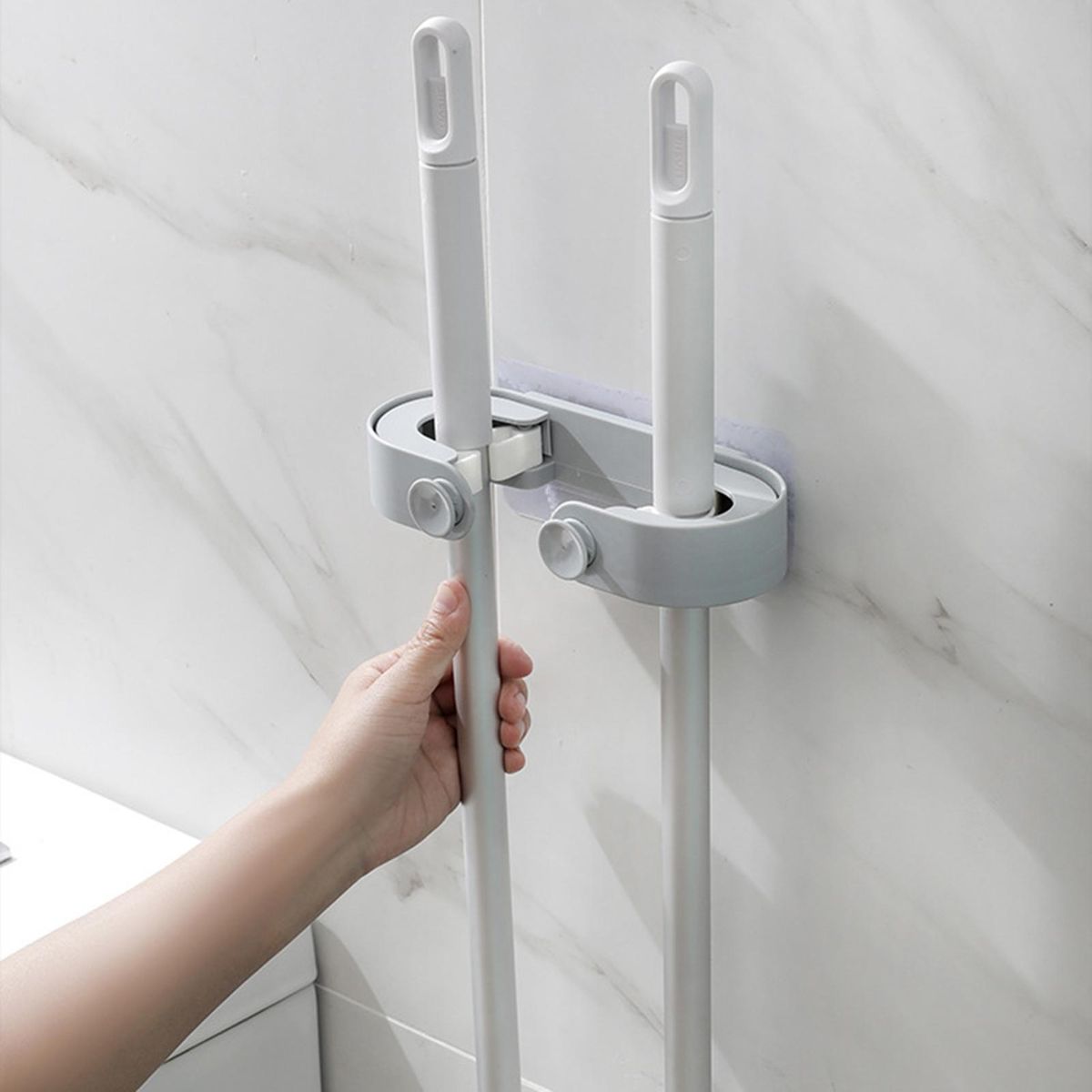 Characterized by self-adhesive design, this mop holder can be installed on the smooth wall without drilling and be easily removed.