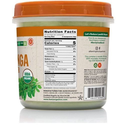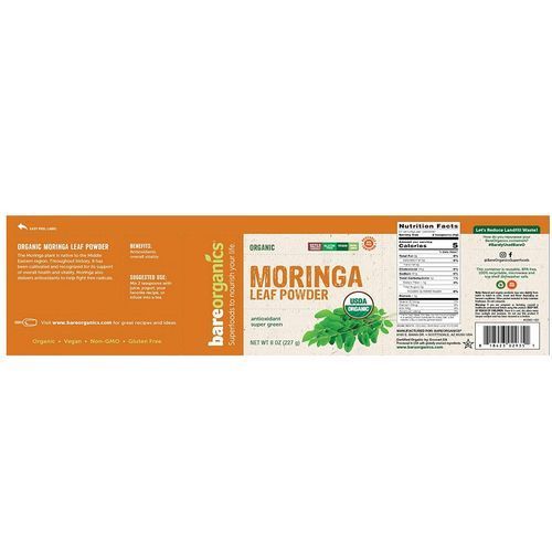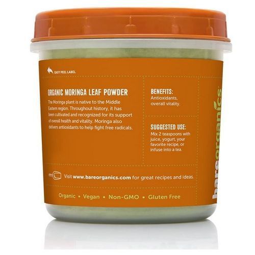 The Moringa plant is native to the Middle East region. Throughout history, it has been cultivated and recognized for its support of overall health and vitality. Moringa leaf powder also delivers antioxidants to help fight free radicals. Organic moringa leaf powder has been long used in traditional medicine throughout South Asia and other countries as well over time. In some parts of the world, it is referred to as the “drumstick tree,” or the “horseradish tree.” This vegan supplement is full of antioxidants and supports overall vitality. Superfoods deliver essential fu el for your body with unique micro and macronutrients to keep you feeling your absolute best. Bare Organics' raw, organic superfood powders make it easier for the body to recognize and utilize key nutrients. Each package of this moringa leaf supplement weighs 8 ounces. The organic dietary supplement is 100% recyclable, BPA-free and reusable with an easy-peel label and is both microwave and top shelf dishwasher safe.