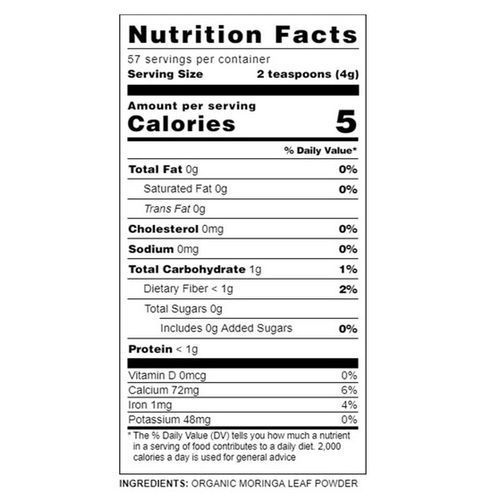 Quantity and Packaging: Each package of this moringa leaf supplement weighs 8 ounces. The organic dietary supplement is 100% recyclable, BPA-free and reusable with an easy-peel label and is both microwave and top shelf dishwasher safe.