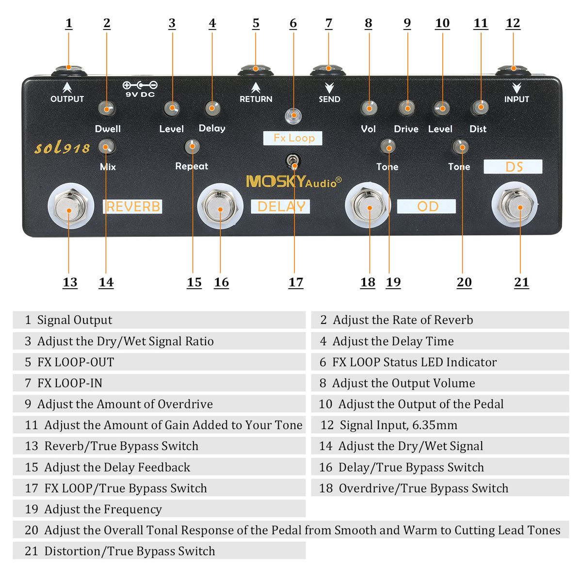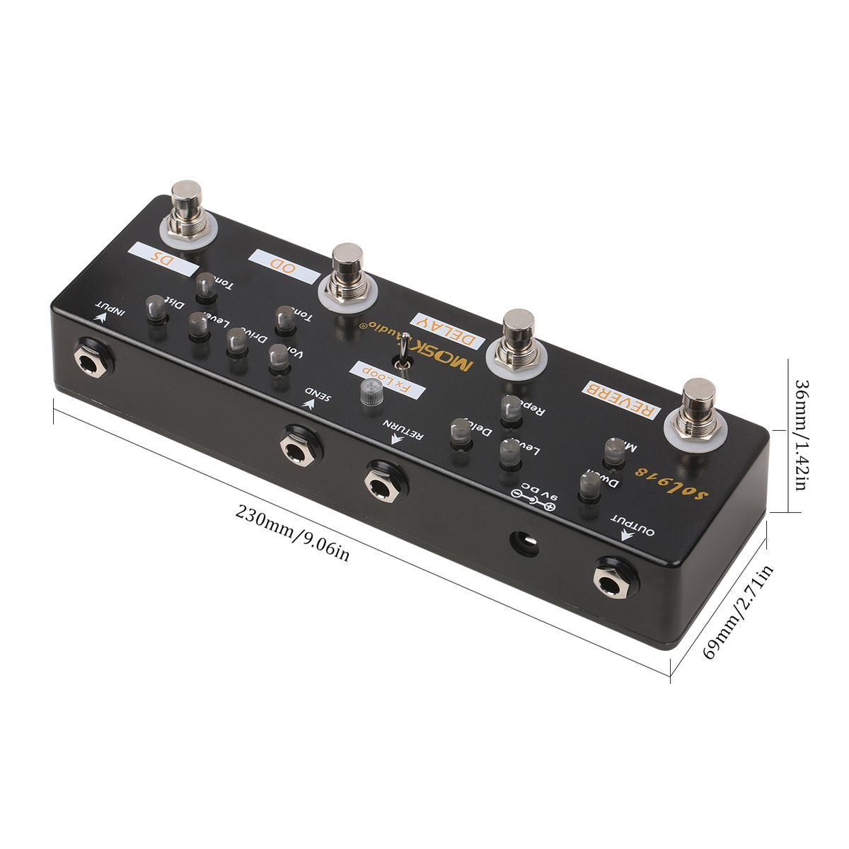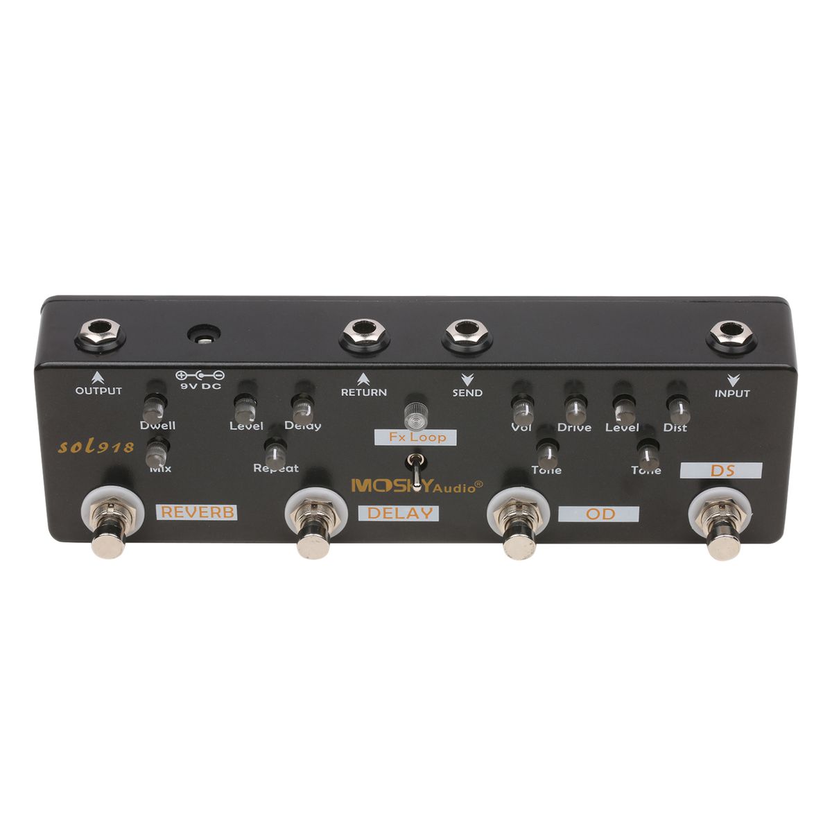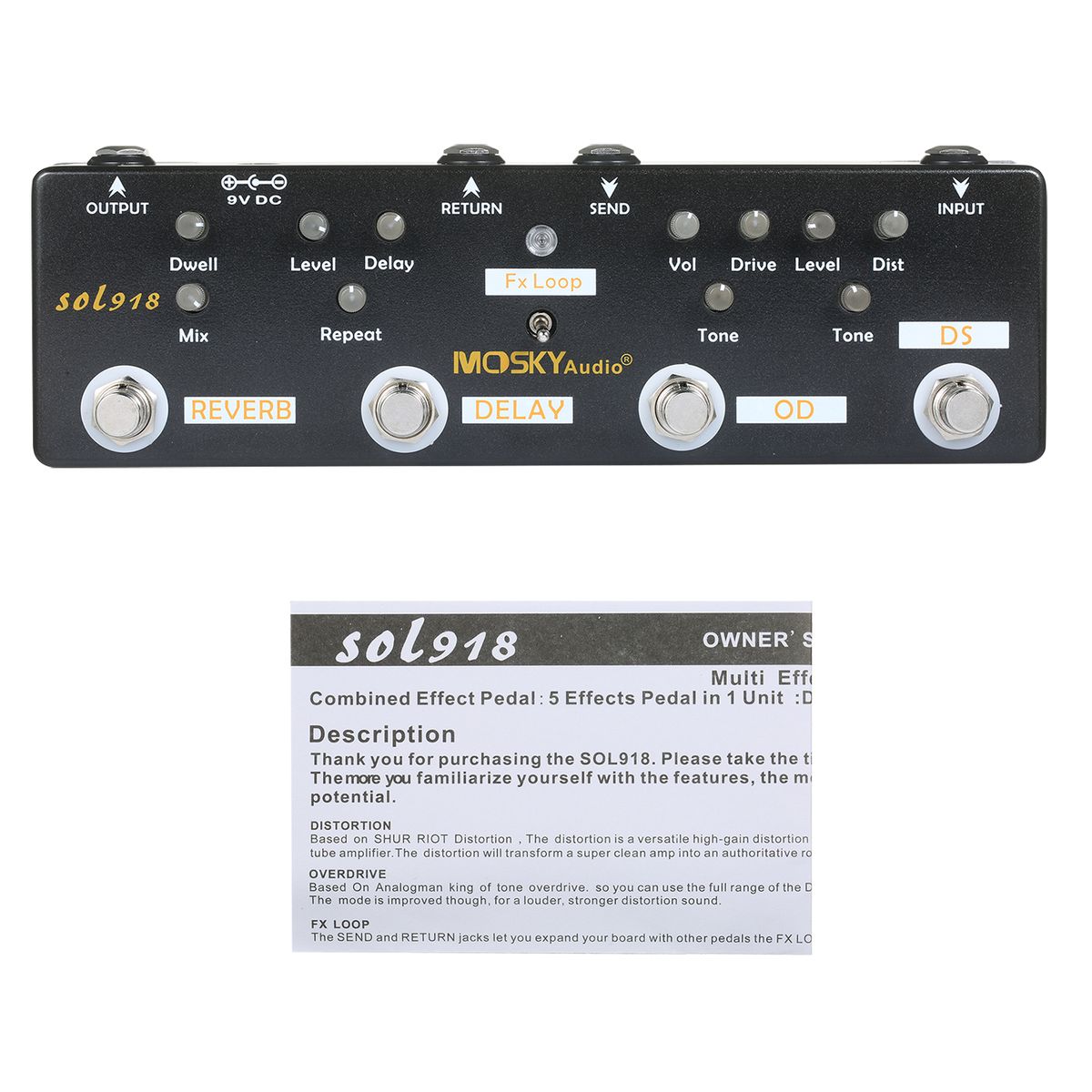Multi-Effects Pedal: Reverb+Delay+FX Loop+Overdrive+Distortion, 5 effects in 1 unit.