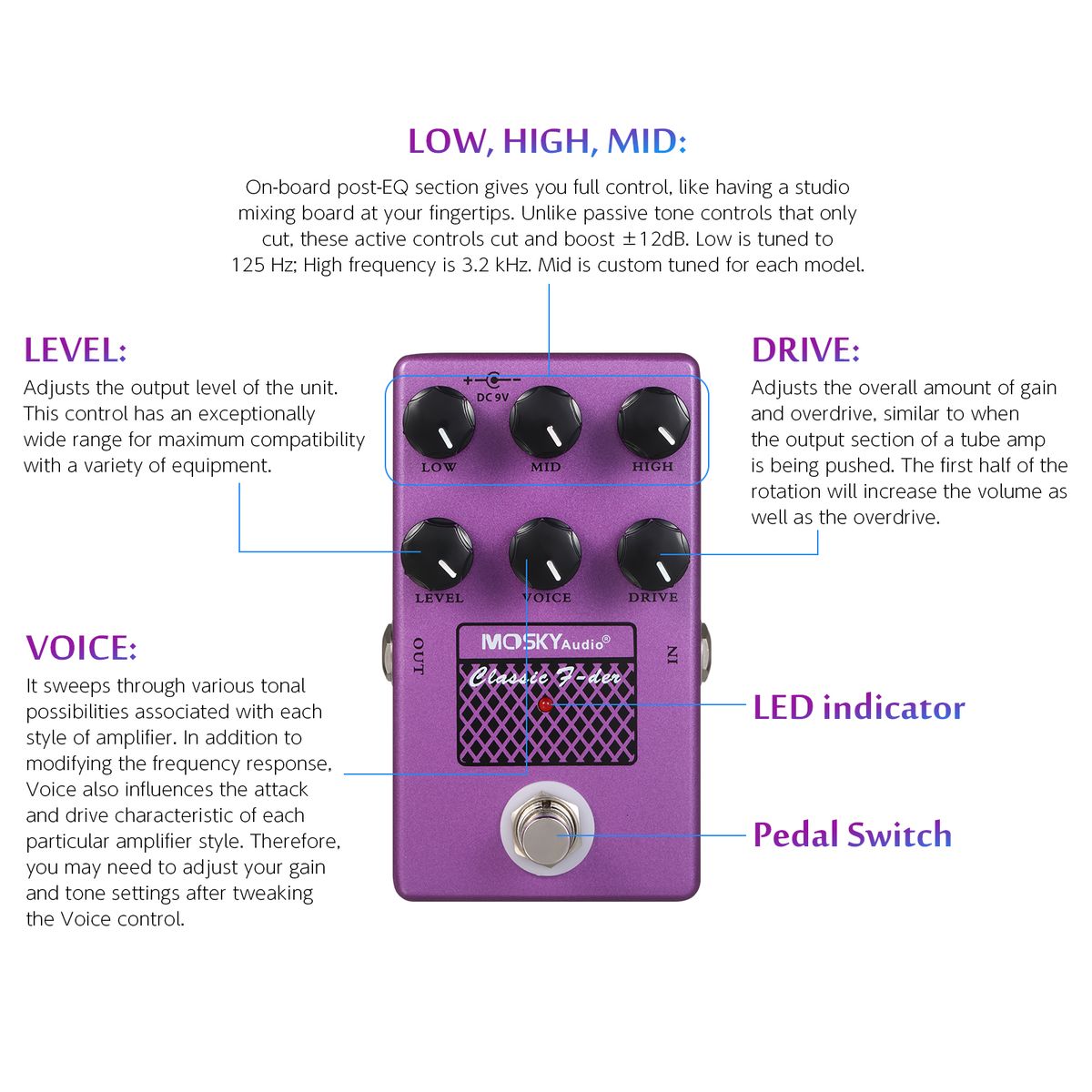 VOICE: Voiced differently for each pedal in the series. It sweeps through various tonal possibilities associated with each style of amplifier. In addition to modifying the frequency response, Voice also influences the attack and drive characteristic of each particular amplifier style. Therefore, you may need to adjust your gain and tone settings after tweaking the Voice control.
