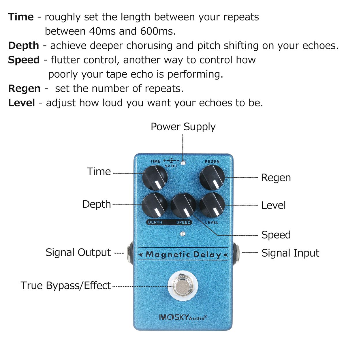Time - roughly sets the length between your repeats between 40ms and 600ms. This range is well suited for classic, vintage delay sounds that are great for slap-back or medium length delay times.