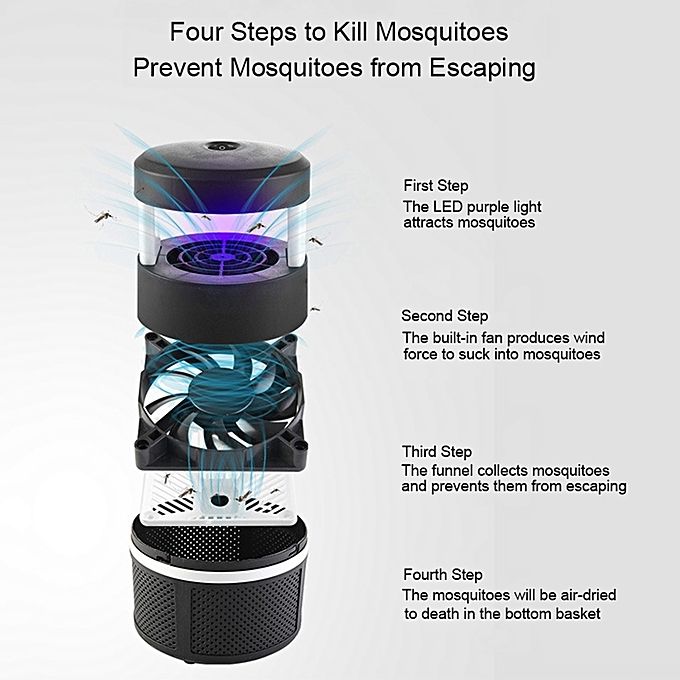 Strong suction, when the mosquito is close to the lamp, it will be sucked into the bottom by the airflow of a fan, and then the mosquito will be air-dried to death in the bottom closed basket.