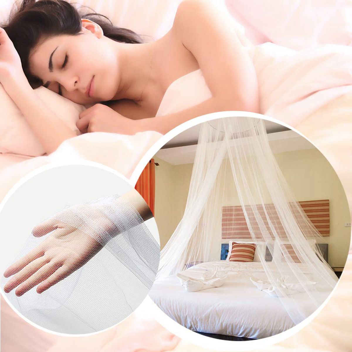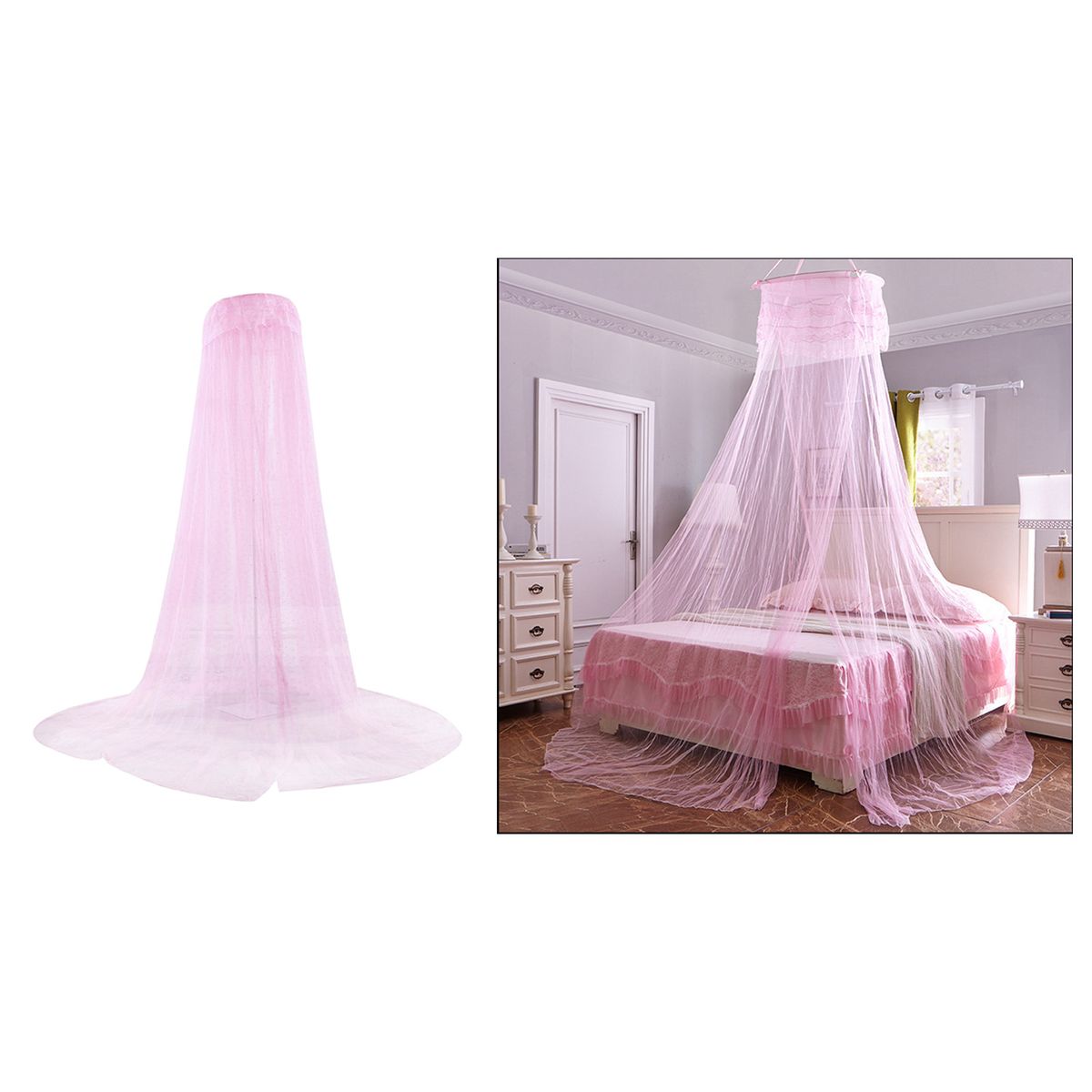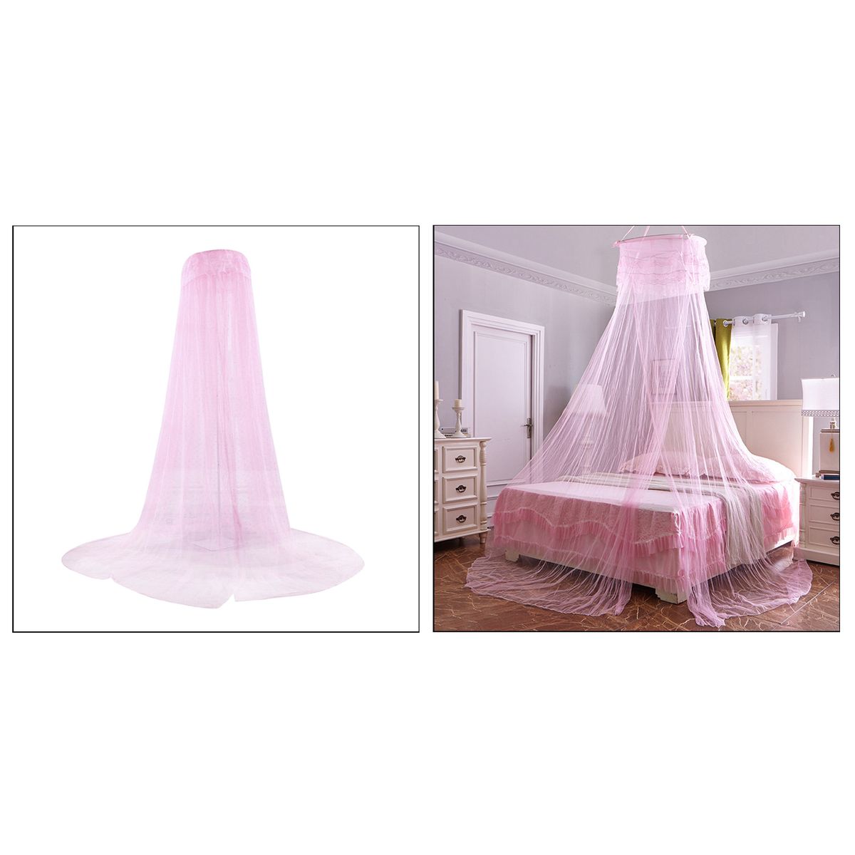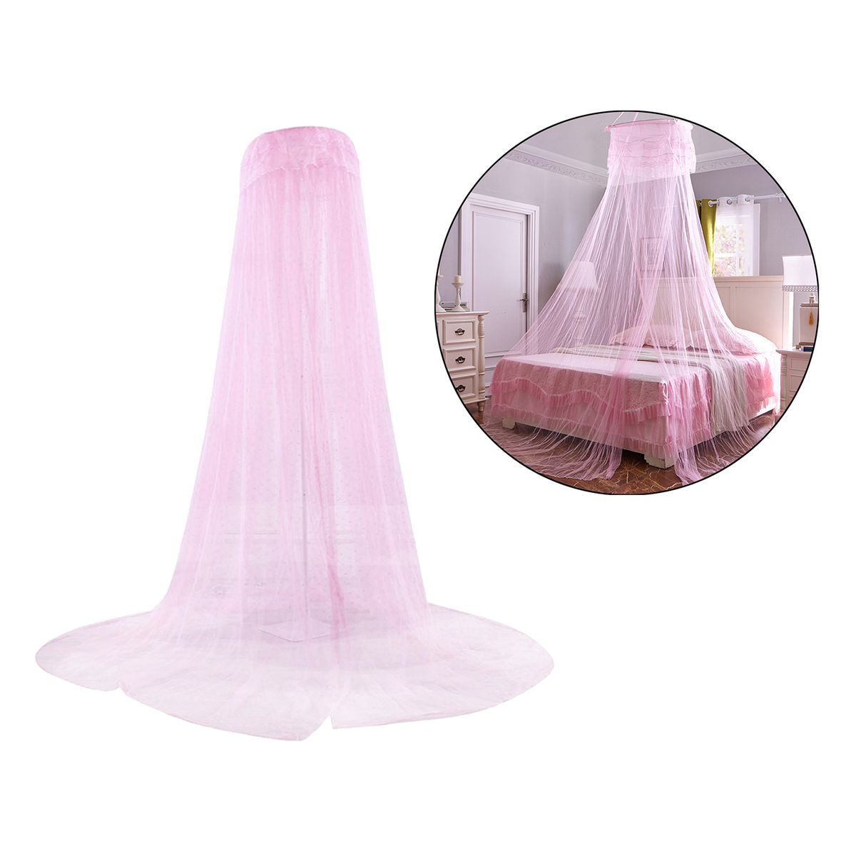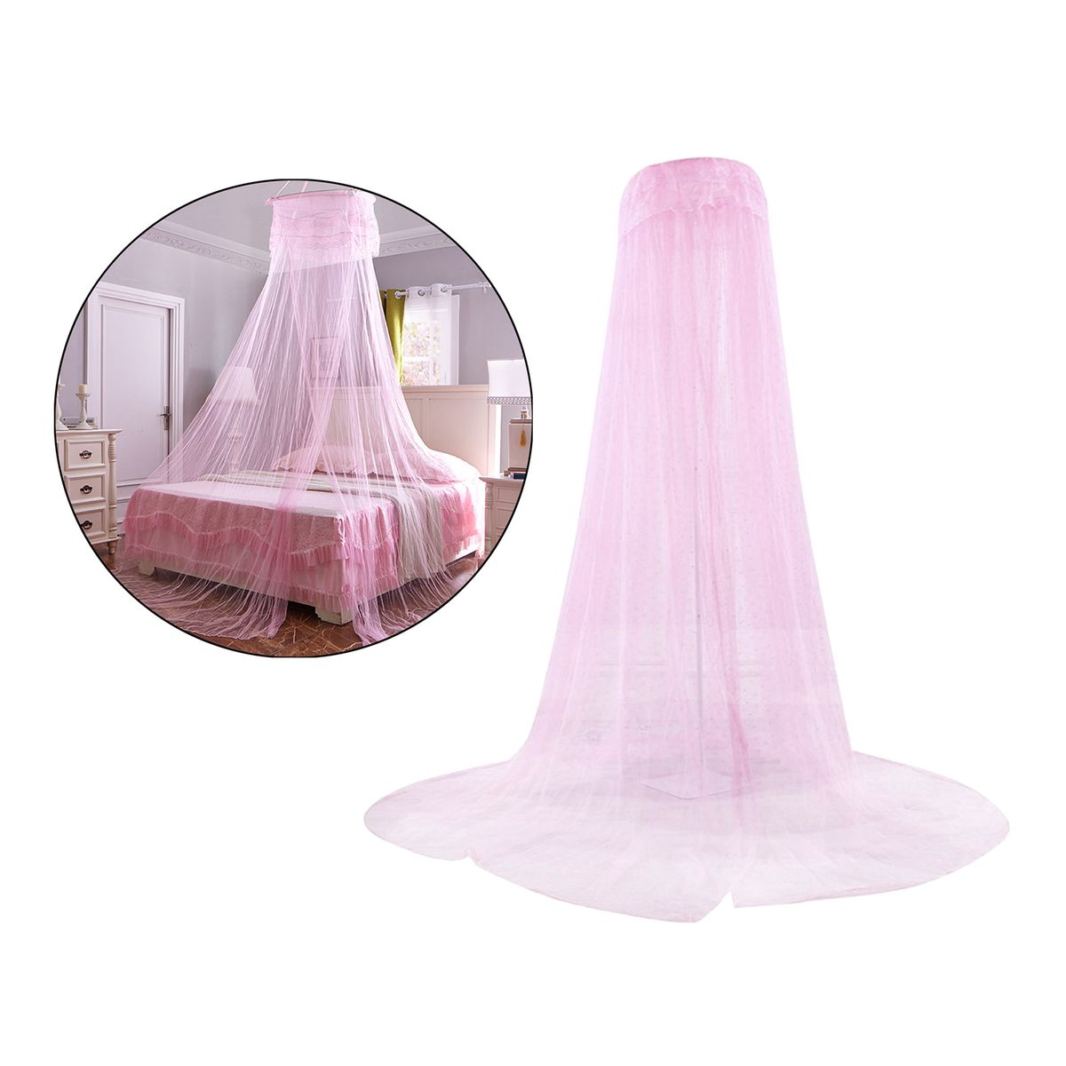 Generous Size: Our bed canopy, which measures 60x260x900cm/2x8.5x30ft (circle diameter*height*hem length), is large enough to fit kinds of beds from single to king size and so on. can easily protect you and your family.Made from polyester material, lightweight and portable. breathable and allow the air to circulate. provides you comfortable sleeping.The round dome design and the draped effect makes it a romantic deco for bedroom. can also be used outdoors to keep the nasty insects outside.With a strong suction cup, hook and screws, easier to install.Note: Can be used when the height from the bed surface to the roof is greater than 2 meters.