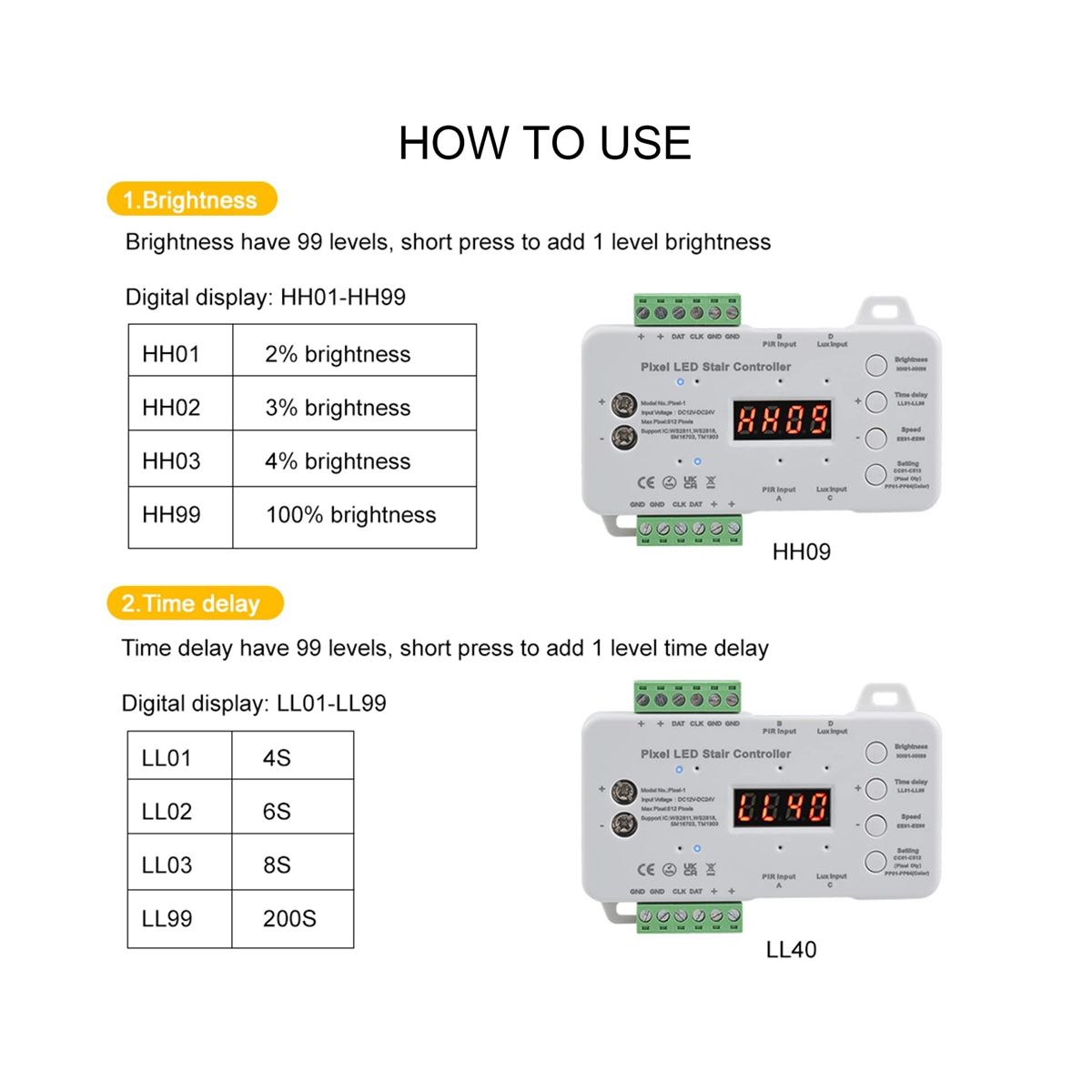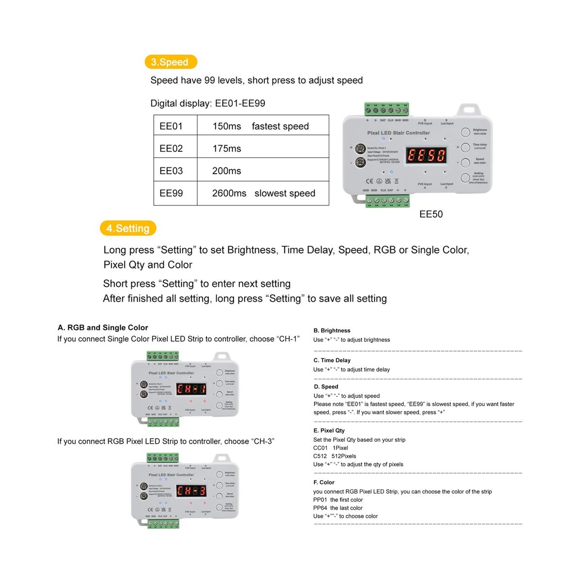 Suitable for RGB light strips, LED Smart Stair Lighting Controller is suitable for monochrome light strips and RGB light strips. Select CH-1 if you are connecting a monochrome pixel to the controller. Choose CH-3 if you connect an RGB pixel to the controller.