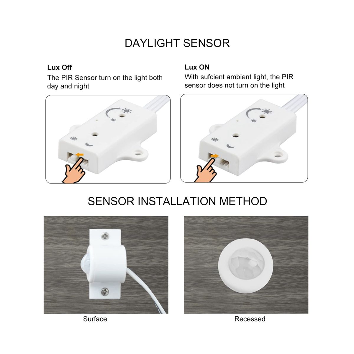 The motion sensor activated LED stair light controller automatically turns on to illuminate the stairs when you reach the top or bottom step, and turns off when people leave. With daylight sensor, the PIR sensor will not turn on the light when the ambient light is sufficient.