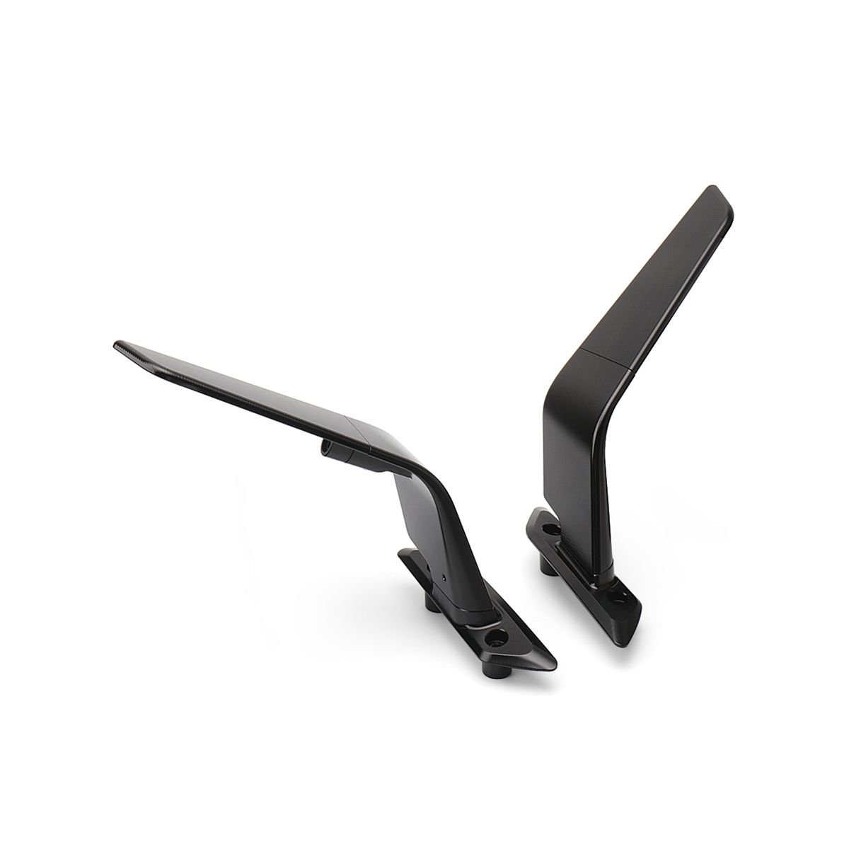 Out of the interface between racing experience and aeronautical inspiration comes a new mirror: an accessory specifically designed for supersport bikes. It consists of a fixed part, which allows the fitting directly to the fairing, and a movable part, which acts as a mirror glass holder. Thanks to a rotating system, by a simple movement, the two parts get alligned: in closed position the mirror becomes an aerodynamic foil.