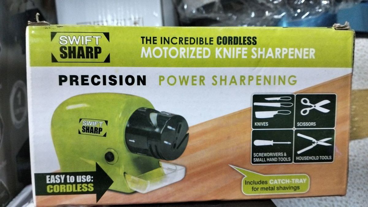 Sharpen Your Knife Blades Quickly & Easily Stop wondering what to do about your tired, old kitchen knives and let Swifty Sharp make them as sharp as they day you bought them. This beautifully designed unit won't take up valuable space in your kitchen or on your work bench. It comes with a multi-use attachment with six slots to accommodate a wide variety of blades. Sturdy construction of plastic/metal. Uses 4 AA batteries.