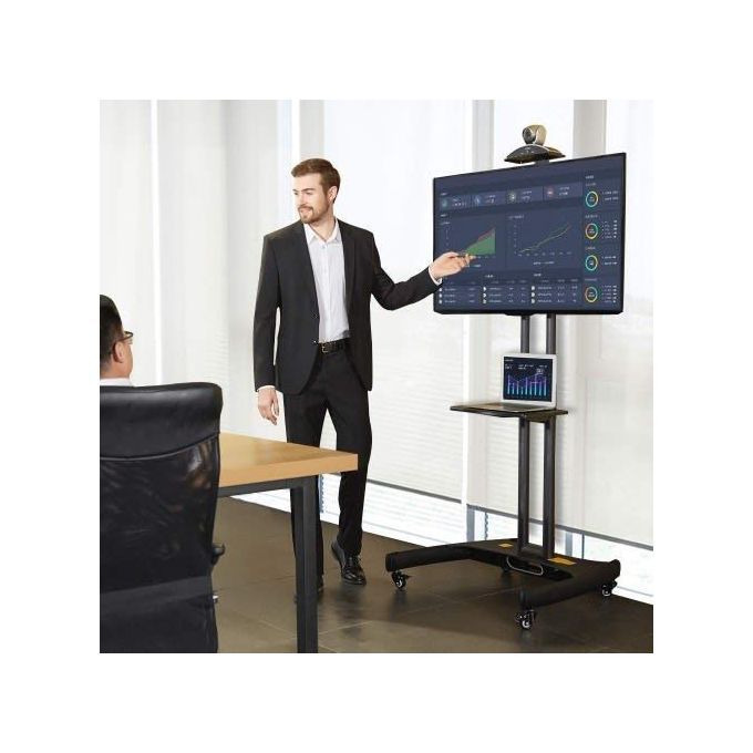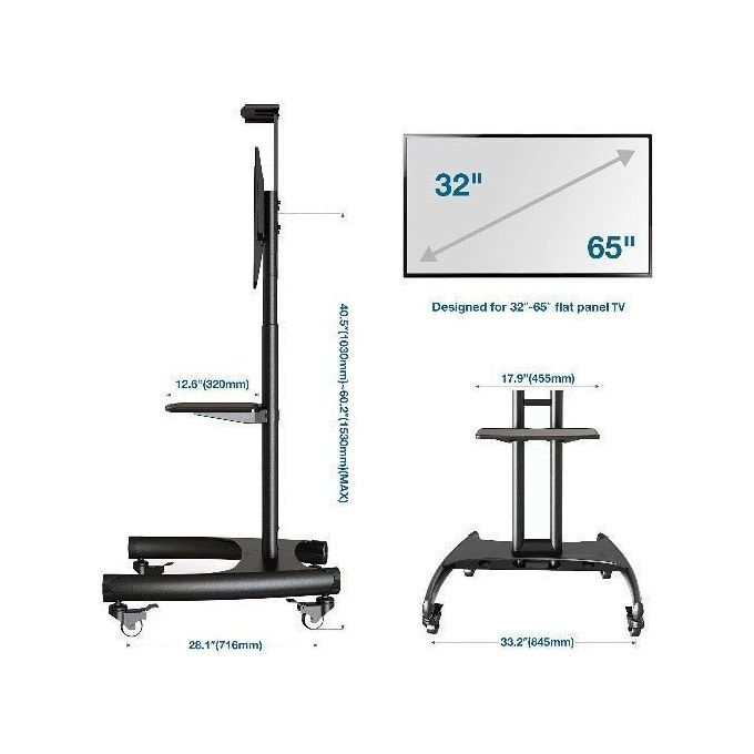 This universal mobile TV Stand with mount is compatible with most 32"-65" Flat and Curved Panel LED, LCD, and Plasma TVs on the current market. The rolling universal black steel TV cart offers a great solution for business presentations, educational sessions or any other information sharing venues. This cart allows you to hold teleconference meetings or just display information in any location with an electric outlet. The tv stand can be used in conference rooms, at expos and tradeshows, as well as in classrooms. Besides, you can always mount your computer monitor on the stand and enjoy a video game. All in all, this mobile tv stand will meet your needs whatever they are. Whether you own or rent, avoid putting holes into your walls and use a TV Cart instead. The cart is equipped with 4 brake castors which allow you to roll it from one room to another your house and provide stable fixation of your tv screen on site. zero eight zero three four three one four three one seven for seller further enquiry