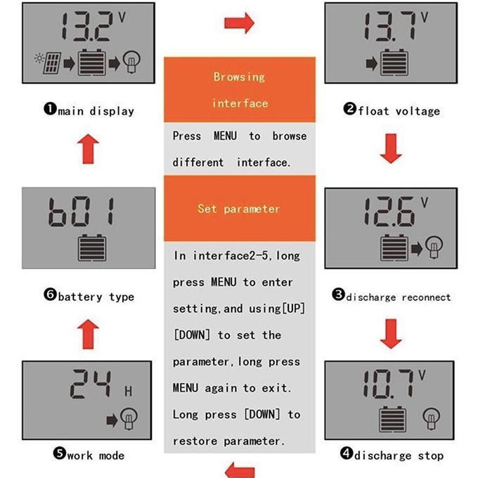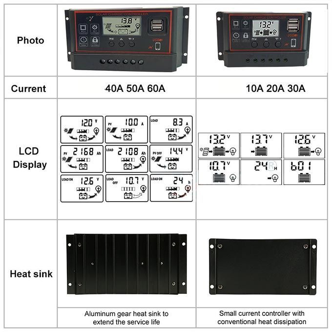 - Large screen LCD display, charge and discharge current display, cumulative power generation and discharge power query, temperature display, light control + delay control; adjustable charge and discharge parameters, with power-off memory and other functions.
