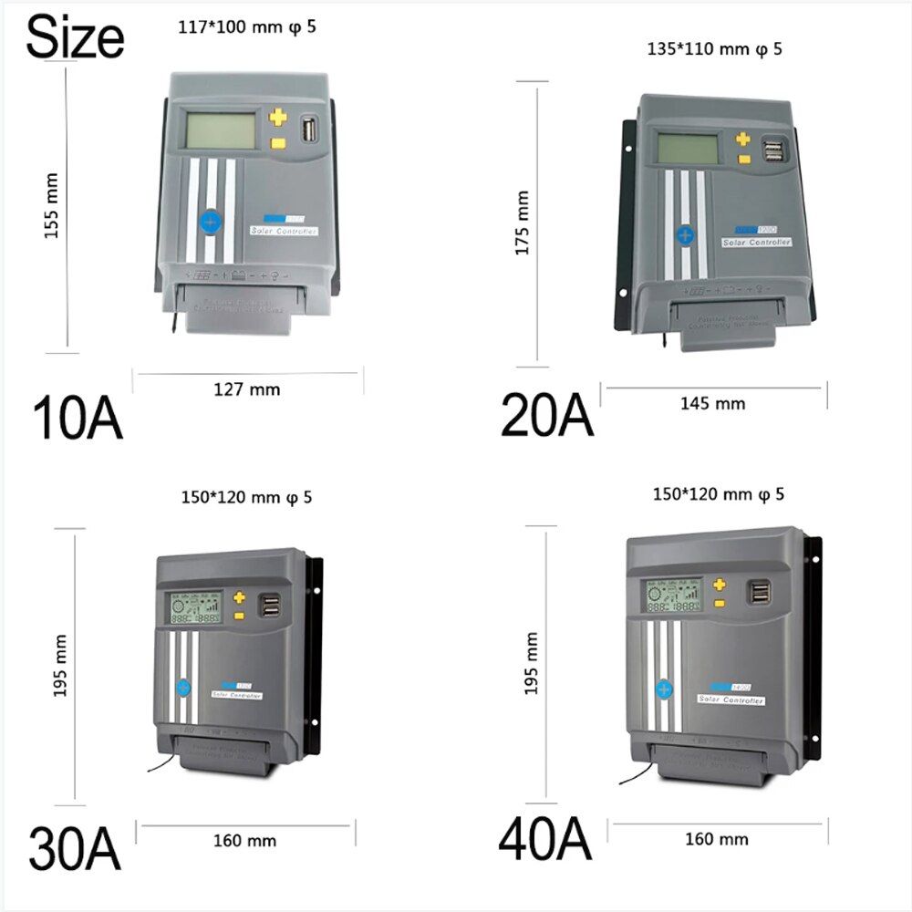 MPPT LCD Display 10A 20A 30A 40A with WIFI 12V/24V Solar Panel Battery Regulator Charge Controller Dual USB LifePo4 or LithiumMPPT1 series products adopts DC/DC converting technology and MCU technology. It can adjust the working point of the solar array intelligently to make the solar array realize the maximum power output.When the external condition changes,MPPT controller bases on the MCU theory to track the maximum working point of solar panels,this can improve the using efficiency of the solar panels and decrease the solar generating costs.Compared with PWM solar charge controllers,MPPT improve the output efficiency of solar panel by 5% to 30%(the output increasing proportion affected by the factors such as the attribute of solar panels,envmental temperature and lighting conditions).There are optional 10A 20A 30A 40A model:PARAMETERModelBattery VoltageMax solar panel input10A12V100V 120W24V100V 240W20A12V100V 240W24V100V 480W30A12V100V 360W24V100V 720W40A12V100V 500W24V100V 1000WFeatures:1. Self-made algorithm,fast and accurate lock MPPT point,within 10 seconds,accuracy is greater than 99%,MPPT peck conversion efficiency 98%.2. Four-stage charging:high current charing at MPPT points,float charging,absorption charging,equalized charging.3. Can be used for lithium battery(LiFePO4 battery,ternary lithium battery),when the lithium battery is low voltage protected,the battery can be activated.4. External temperature sensor,accurate temperature compensation.5. PV input maximum voltage:100V.6. The system voltage is 12V/24V automatically identification.7. Communication function(with built-in or external WIFI,Bluetooth, module),providing standard MODBUS communication protocol.