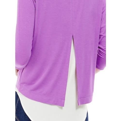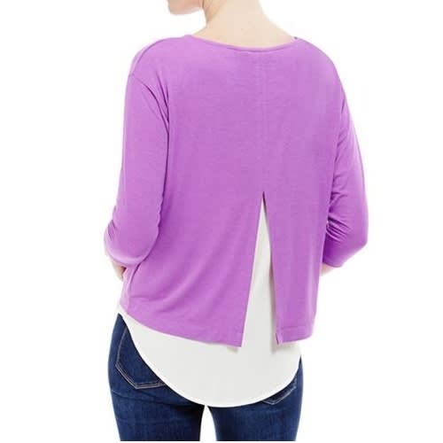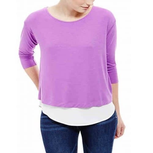 M & S Mauve White Satin Trim Mock Layered Top 3/4 length sleeves work to discreetly flatter your look. Scoop neck and a curved hem with rear split and panel detail. Added stretch. Material: 78% Viscose - 17% Polyester - 5% Elastane Care: Machine Wash