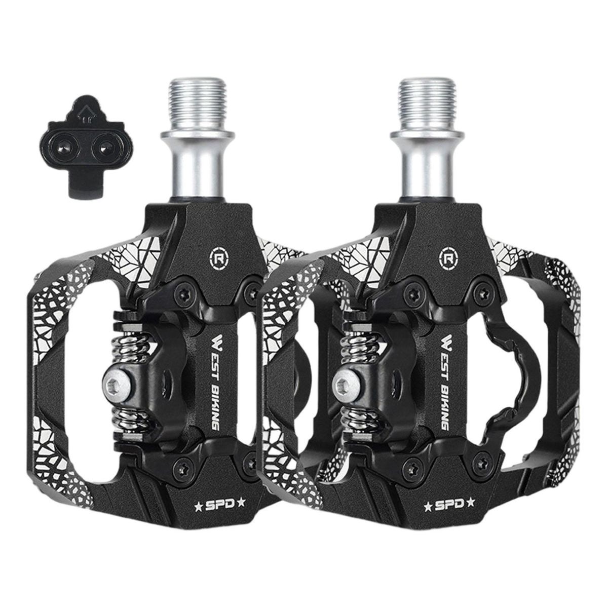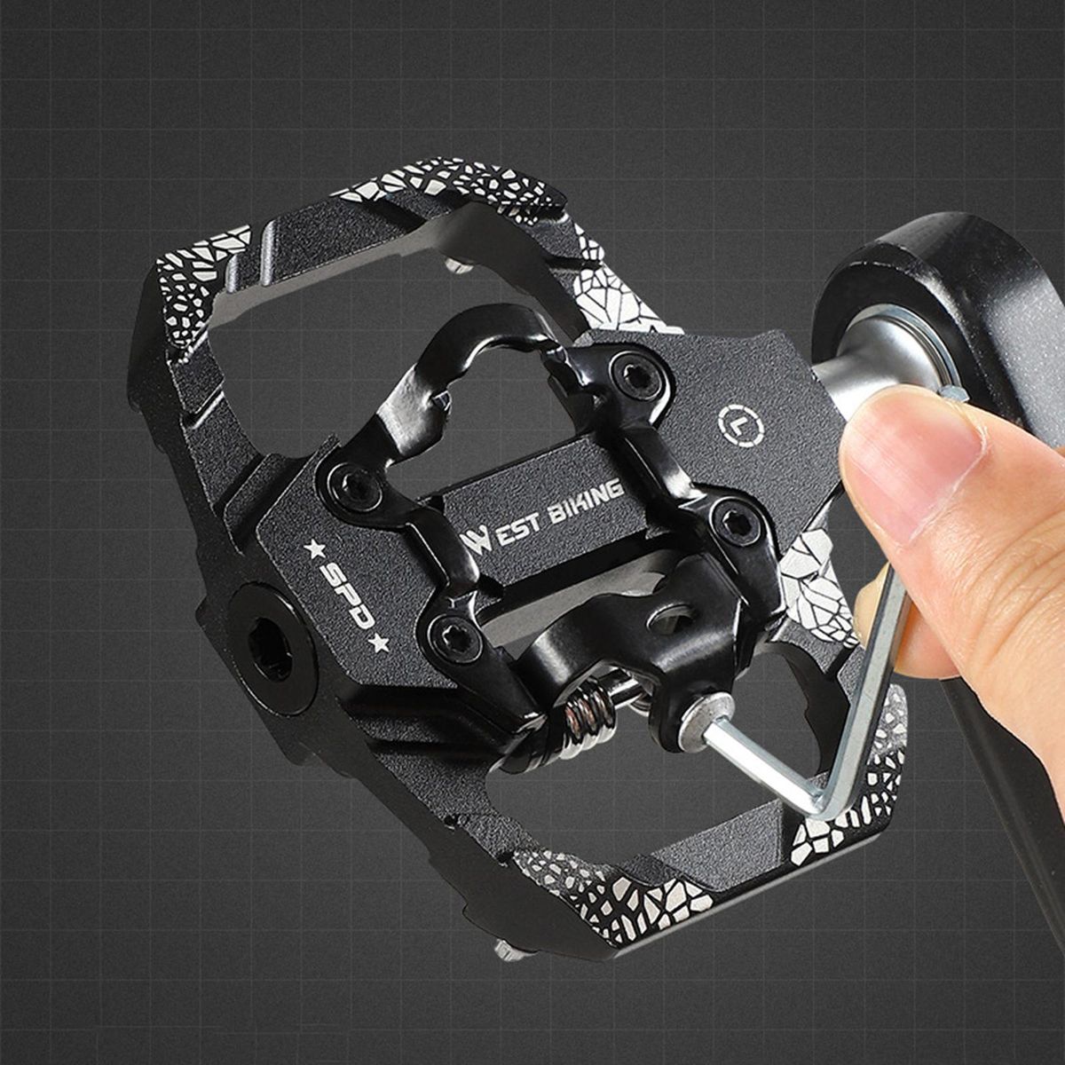 Material: The MTB Bike Pedals are made from high quality aluminum alloy material, strong and wear resistant, has a long service life.Dual Platform Pedals: Double sided bicycle pedal, one side is a traditional platform for use with regular shoes, and the other is suitable for SPD cycling shoes. With stainless steel cleats, has strong gripping force.Sealed Bearing: 3 Sealed Bearings ensure the smooth and reliability of the bike pedals, protecting the spindle from water and dust, avoiding rust to cause friction noise when cycling. Adjustable: The cleats tension could be adjusted, clipping in and out is very easy after you adjust the tension as your like, making you better control the pedals. Universal: 9/16" Spindle, 14mm thread fits for MTB Mountain Bike, bike, folding bike, touring bike, Trekking bikes, etc.