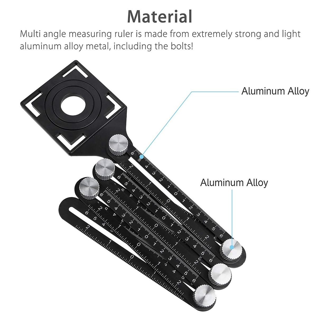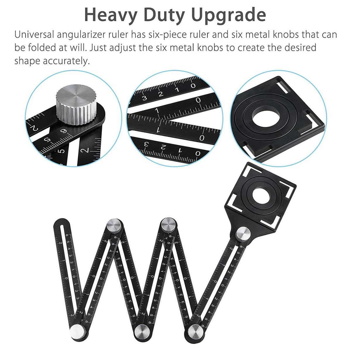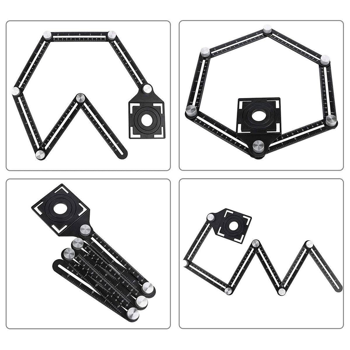DURABLE MATERIAL: Made of aluminum alloy with laser-engraved scales, the multi angle measuring ruler is wear-resistant and does not break from bending or rusting. You can use it for a long time. Compared with the plastic version, our angle finder tool provides a more durable, sturdy construction.PROFESSIONAL TOOL: Designed with a tile hole locator, the multi-angle ruler helps you quickly find the correct position to drill the hole. With a flexible and detachable design with folding 6 sides, you can measure special angles or shapes much easier. It\\\'s a good helper to improve your work efficiency.PRECISE MEASUREMENT AND READING: This angle measurement tool features laser-engraved centimeter and inch lines. It stays clear and easy to read for precise measurements even for extended periods of time. With the 6-part angle tile tool, you can simply adjust the six metal knobs to create a custom template for every job.EASY TO USE: The screws included are large enough for one-handed alterations easily. Just use the sliding ruler to quickly measure the angle and size, lock it in shapes and patterns, then copy to the material you need.IDEAL GIFT CHOICE: The 6-Sided Angle Finder Tool is ideal for creating templates in the measurement and layout of tiles, woods, wallpapers, and carpet laying projects, making the project more accurate and efficient. It\\\'s a perfect gift choice for woodworkers, craftsmen, and handymen.Specifications: