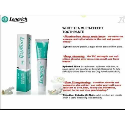For treating tooth pain, weak gum, bad breath & tooth decay. (You do NOT have to remove that tooth!) It is highly effective for every tooth without any future side effect when you discontinue. This product is just more than ordinary toothpaste, it's made from natural herbs and it helps to kill the bacteria that eats up the gum, whitens the teeth and freshens the breath. It's a testimony for people with tooth problems. It comes in 200g pack. This Longrich White Tea Multi-Effect Toothpaste has the following attributes:For treating tooth pain, weak gum, bad breath and tooth decay. Highly effective for every tooth without any future side effect when you discontinue. Flourine free decay resistance makes your mouth healthy and clean. The combination of TCS and soft abrasive can make your mouth clean and healthy. The blend of strontium chloride and aloe extract can protect gum and strengthen your teeth at the root. It does not contribute to tooth decay and may reduce tooth cavity. It abrasive to clean teeth, remove plaque and it has a dispersant properties. It has an antioxidant and anti-carcinogdenic properties of green tea. It provides an extra benefit to health beyond it anti-gingivitis effect in toothpaste. It contains a mineral supplement required by living organism. It contains strontium chloride hydrate to reduce pain in sensitive teeth and helps in building bone.