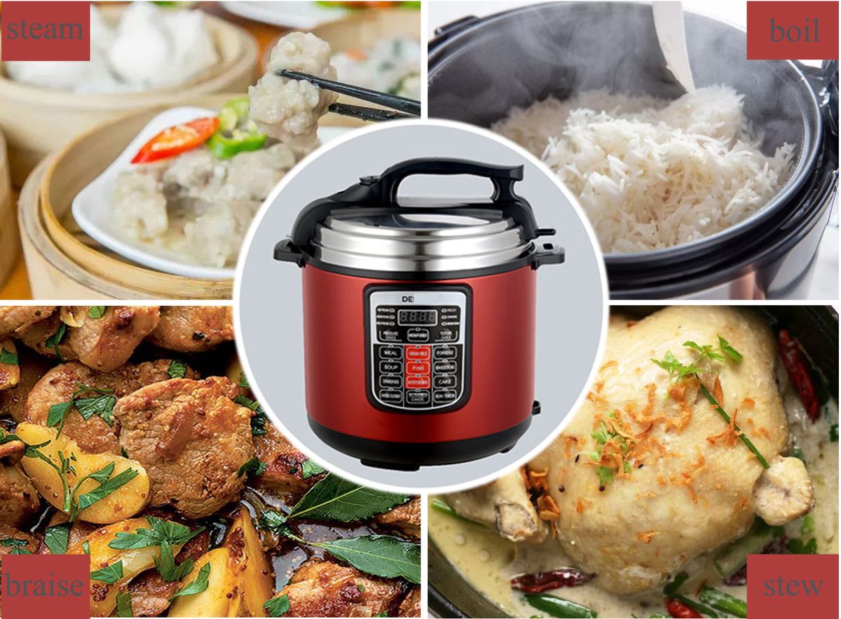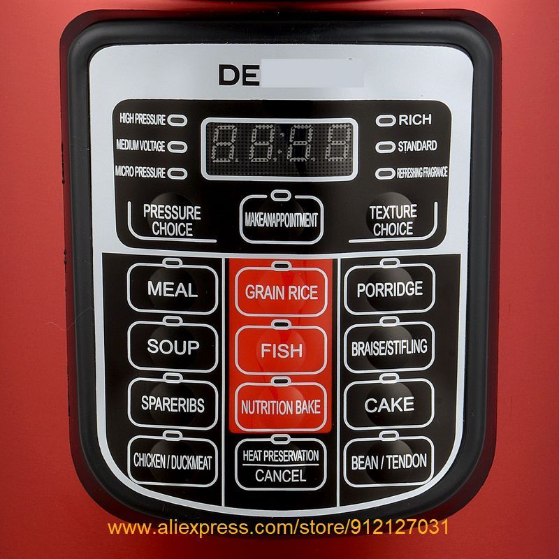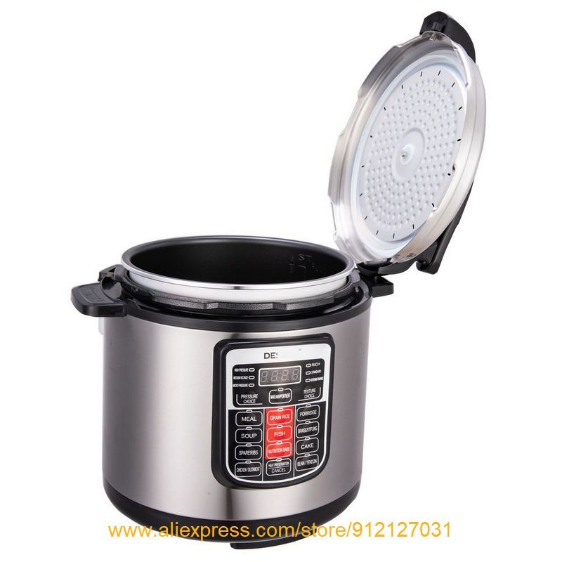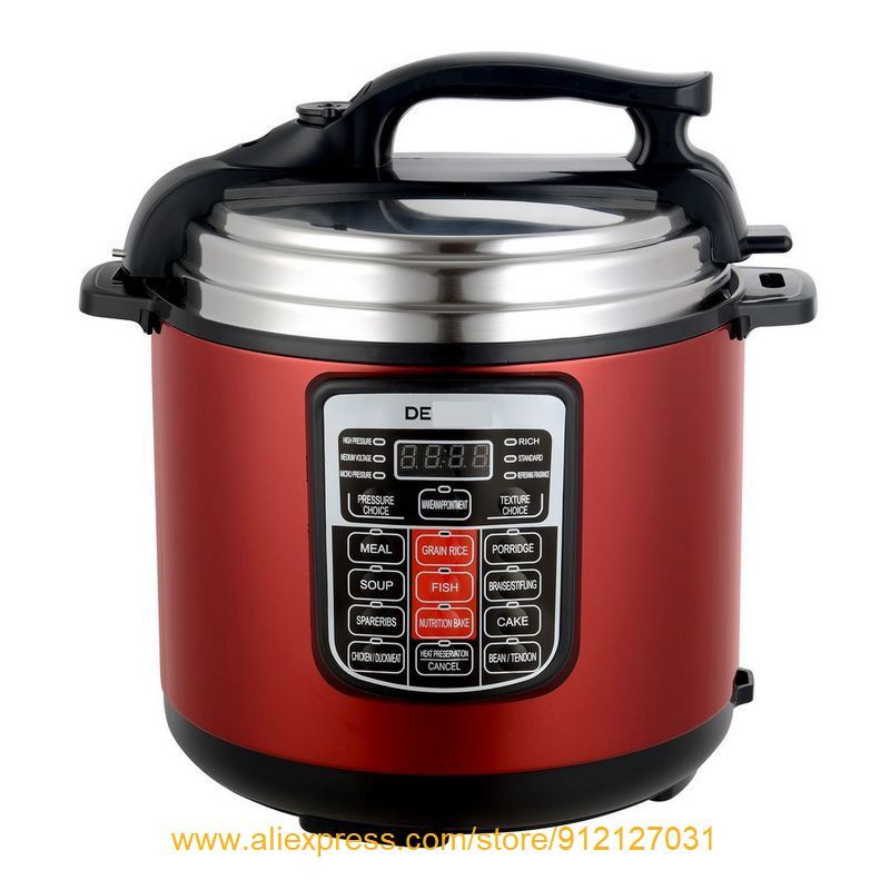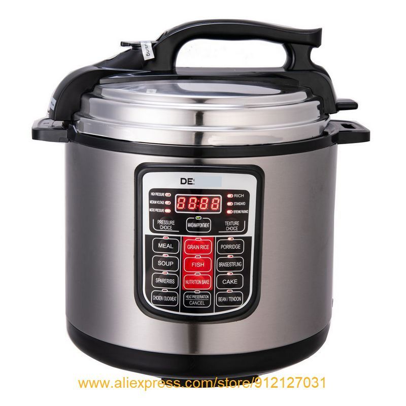 Hot Electric Pressure Cooker, with intelligent control in basic English. Simple operation & multi-functions, making healthy & tasty meals, saving vitamins and nutrients, cook & keep warm mode, idea for baby food preparation. 6L is perfect for stewing a whole chicken. 220-240V, 50-60Hz, 1000WModel NO: XP-04(DES**** logo on the control panel )Features: 1. 6L capacity2. Great export quality, 2 different colors.3. English version, intelligent control, smart operation.4. Multi-functions: , reservation, keep warm, 3 pressure choices, 3 food texture choices,?non-stick coating, anti-burnout and thermal fuse.5. Seven safety protection devices.?6.?Various cooking types: rice, congee/porridge, braise/stifling, cake, bean, soup, spareribs, fish, meat like chicken/duck/ mutton/ beef etc.?7.?AC 220-240V, 50-60HZ, 1000W?8. 1pc/gift box, then carton.9. 6KGS,?35*35*41CM.10. Professional and fashionable design of outlook &?appearance.?