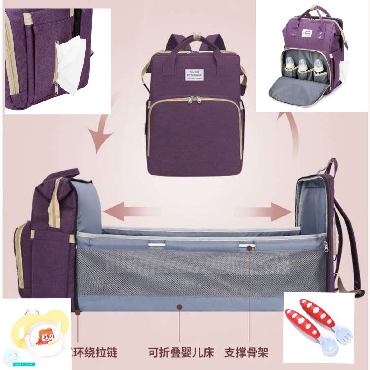 Multiple independent rooms for your different items. A large bottle holder made of special material to keep your baby s milk bottles warm for several hours2. Beautiful3. Designed with a large-mouth opening, large enough to load your baby items like milk bottle, water bottle, baby clothes, baby diaper, towel, etc.4. An opening in the back of the bag, allow you to put things in the bottom of the bag easily.5. Separate bottle bag with foil layer insulation.6. Special tissue bag on side, convinient to pull out the tissue.