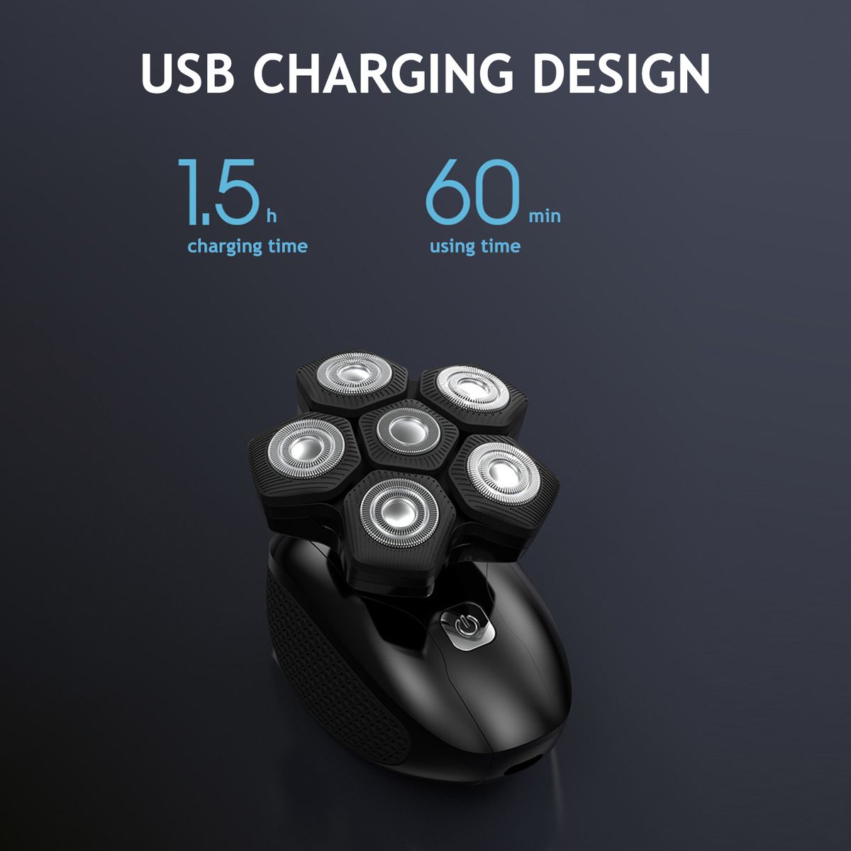 The bald head electric is digital display, magnetic suction cutter head, 360-degree floating shaving, dry and wet double shaving, for cleaner and more comfortable shaving. With barber head, nose hair trimmer head, massage head and cleansing brush, multi-functional shaving set, storaged in a carrying bag.