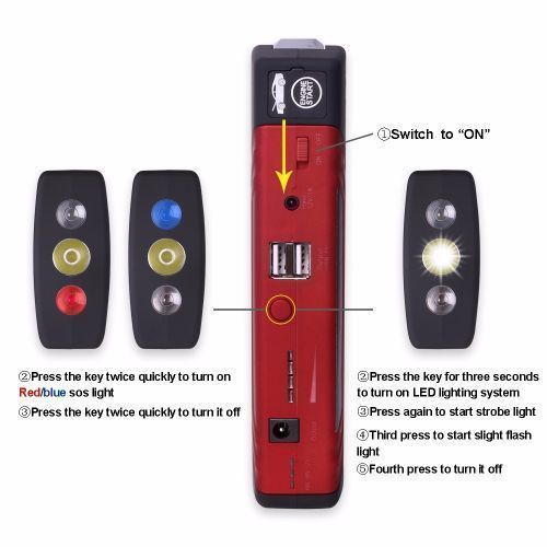 Can used as emergency hammer Speciafications :Battery capacity: 50800mAh Charging mode: CC/CV 12V 1AUSB output: 5V=2AOutput: 12VFull charging time: 2-3 hoursStaring current: 300APeak current: 600A (3S)Lifetime: 3000timesOperating temperature: -20°C -60°CPackage Contains :1 x Multi-Function 12V Emergency Car Jump Starter 16800mAh High-current battery pack - Black / Red1 x Air Compressor1 x Jumper Cable with Clamps1 x Switch Cable A1 x 4in1 mobile phone adaptor1 x Notebook Connector1 x Home Adaptor1 x Car Charger1 x User Manual