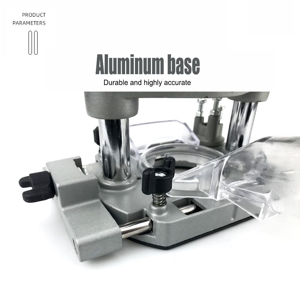 Features:Ergonomic: designed with comfortable handle for easy operation. Strong and stable quick lock design for smooth cutting process.Easy to operate: precision machining for smooth and highly accurate cutting strokes. Replaceable plastic base plate protects the base and glides smoothly over the work surfaceHigh quality materials: the trimmer is robust and durable. Features a clear adjustable base for direct viewing of the cutting trajectory for accuracy and ease of operation65mm diameter: Suitable for machines with a diameter of 65mm. The base kit is made of durable aluminum and plastic with excellent craftsmanship to adapt to the user\\\'s environment for long life and stable performance.Wide range of applications: ideal for woodworking trimming, milling, grooving, slotting, round drawing and other machining operations. The transparent dust collection port is designed to effectively prevent wood from scattering and can be attached to a dust bag. Specification:Name: Press-in double-handle trimmer guardMaterial: alloyColor:As shownSize: 18.5cm x 15cm x 11cm / 28\\\' x 5\\\' x 33\\\' Package included:1 x Trimmer Shroud