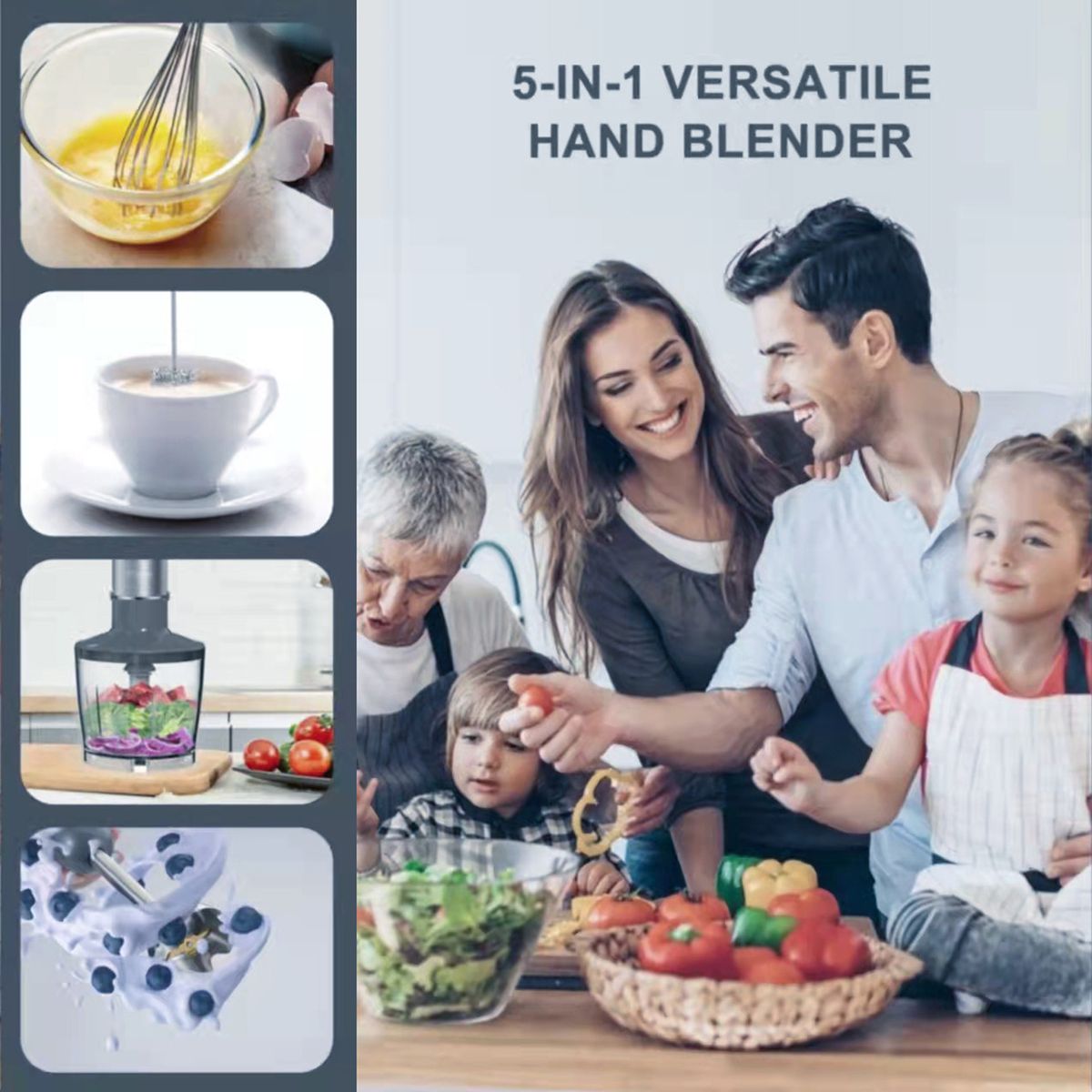 Multifunctional 5-in-1 handheld blender, great for food blending, mixing, mincing, baby food making, and more.