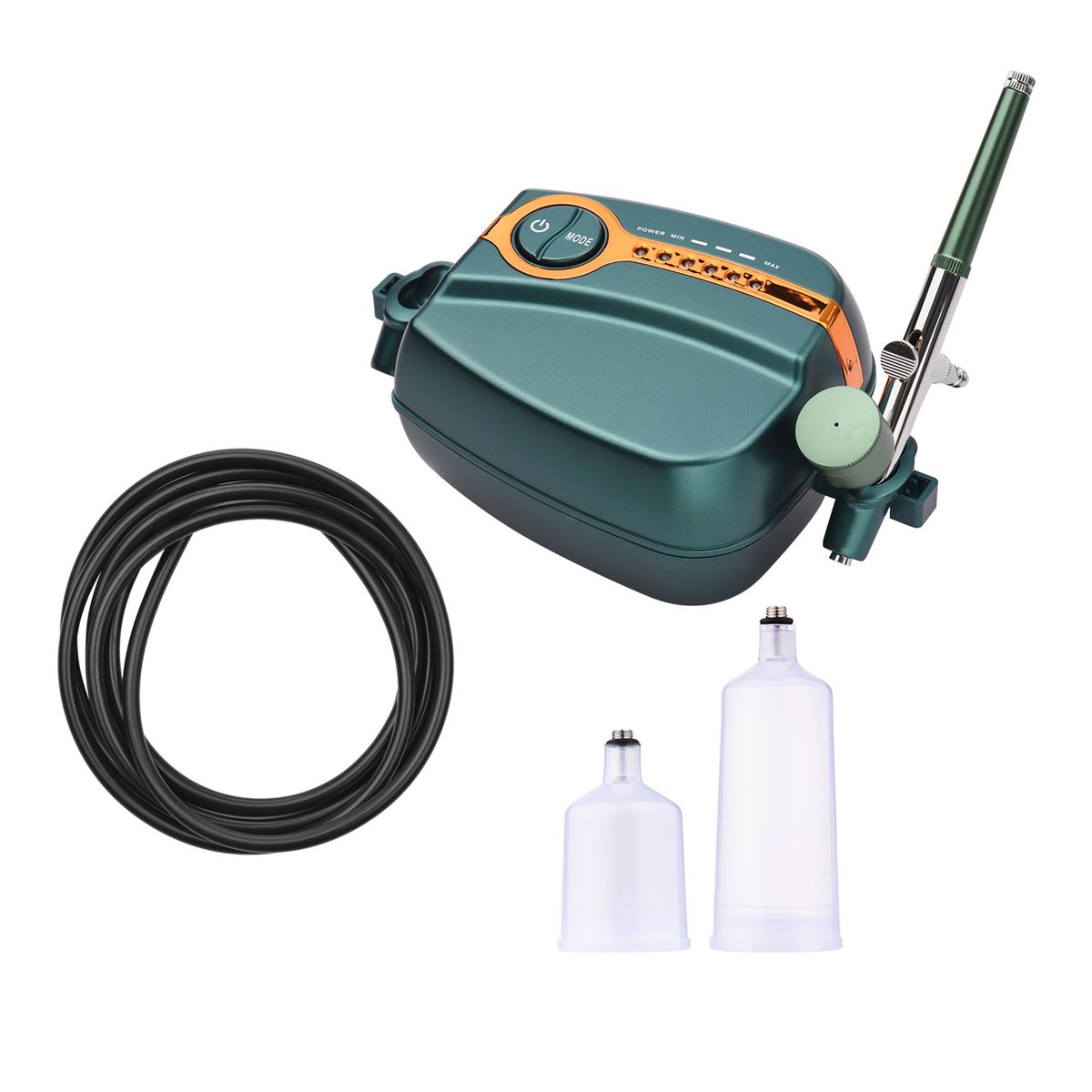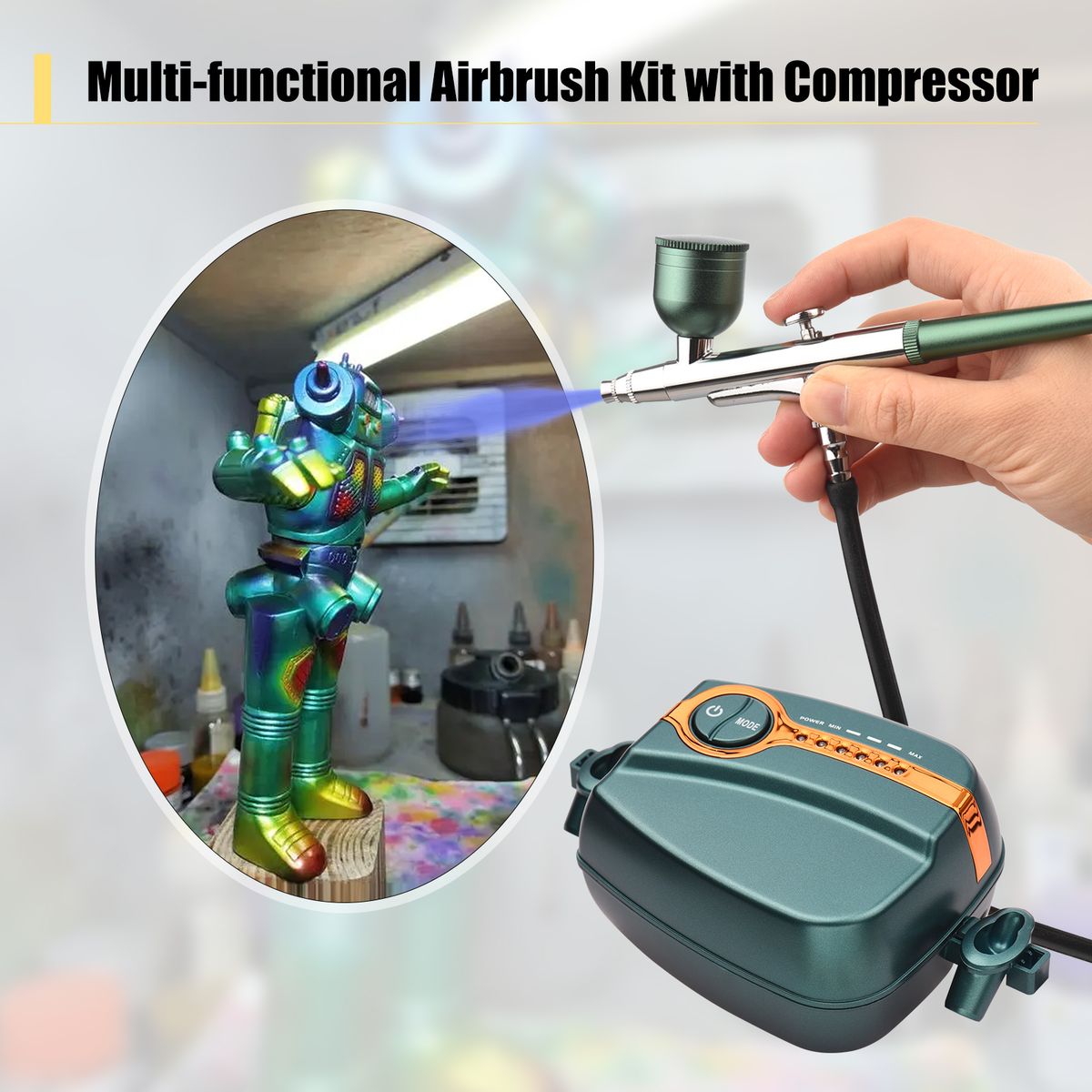【Dual-Action Function for Better Control】This airbrush kit allows you to adjust different air pressure by pressing the MODE button on the compressor, then rotating the airbrush\'s end to adjust the trigger position, so as to adjust the amount of paint, better control for a well-balanced distribution of paint.