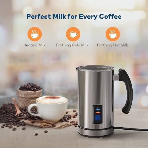 The steam-operated milk frother makes the characteristic hissing noise associated with authentic coffee shops and produces a steam that froths the milk, making great lattes and cappuccinos while also having the versatility to be able to deliver hot water for tea and other hot drinks. Just pour a little milk into a mug and flip the steam control to steam the milk until you have as much froth as you need.