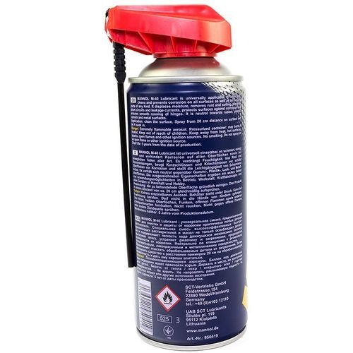 Mannol M-40 lubricant can be used anywhere; it lubricates, cleans, and prevents corrosion on all surfaces types as well as on moving parts; it displaces moisture, removes rust and dirt, and prevents short-circuits and leakage currents; protects surfaces against corrosion and ensures the easy movement of hinges. It behaves neutral to rubber, plastic, paint and metal surfaces.MANNOL M-40 Lubricant is a universal (penetrating, cleaning, anticorrosive, moisture - displacing, anti-squeaking, etc.) aerosol lubricant-an analog of WD-40. It has unique lubricating and protective properties and has a wide range of applications. Ideal for professional and home use. It is a highly effective mixture of fast-penetrating active solvents and oils.