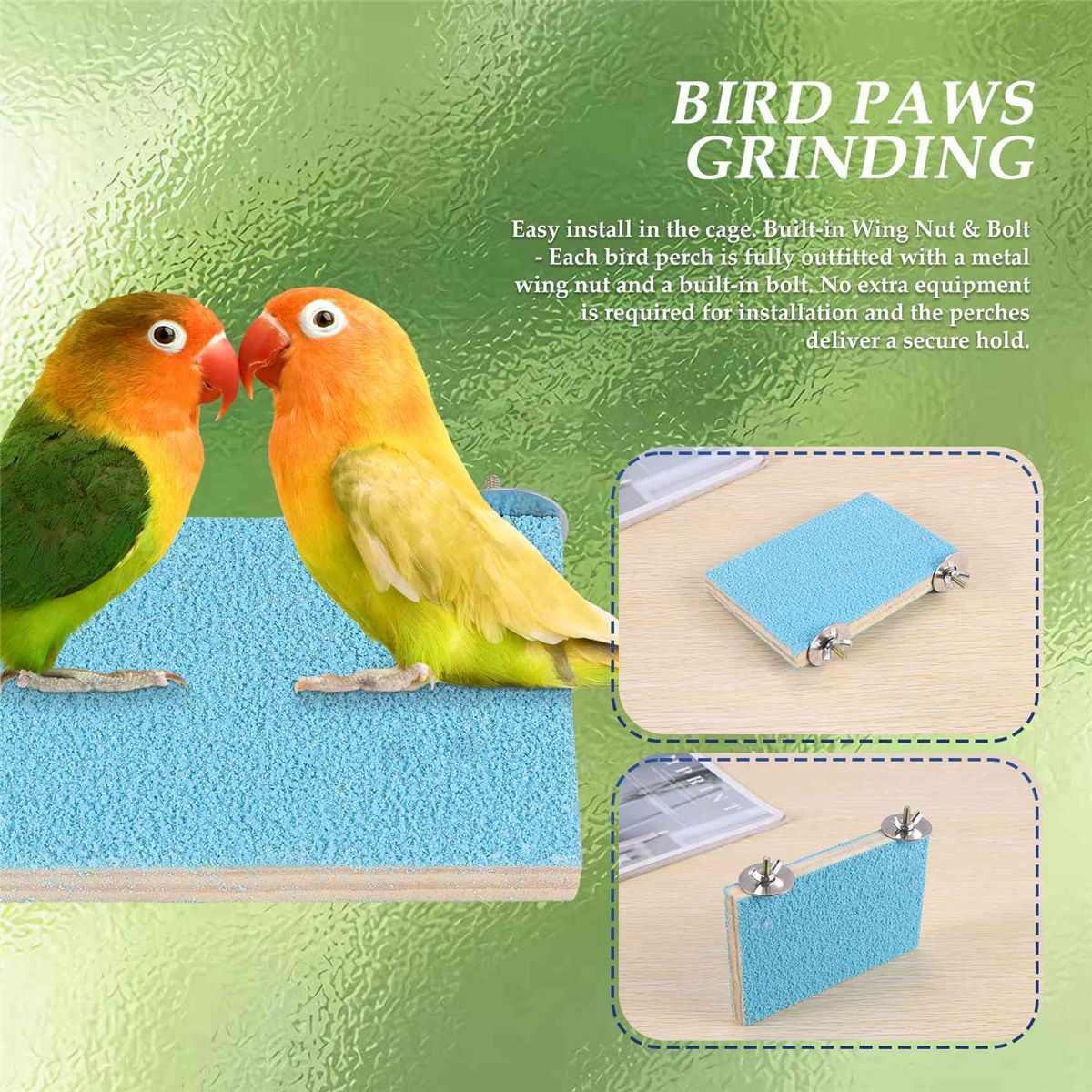 Easy install in the cage. Built-in Wing Nut & Bolt - Each bird perch is fully outfitted with a metal wing nut and a built-in bolt. No extra equipment is required for installation and the perches deliver a secure hold.
