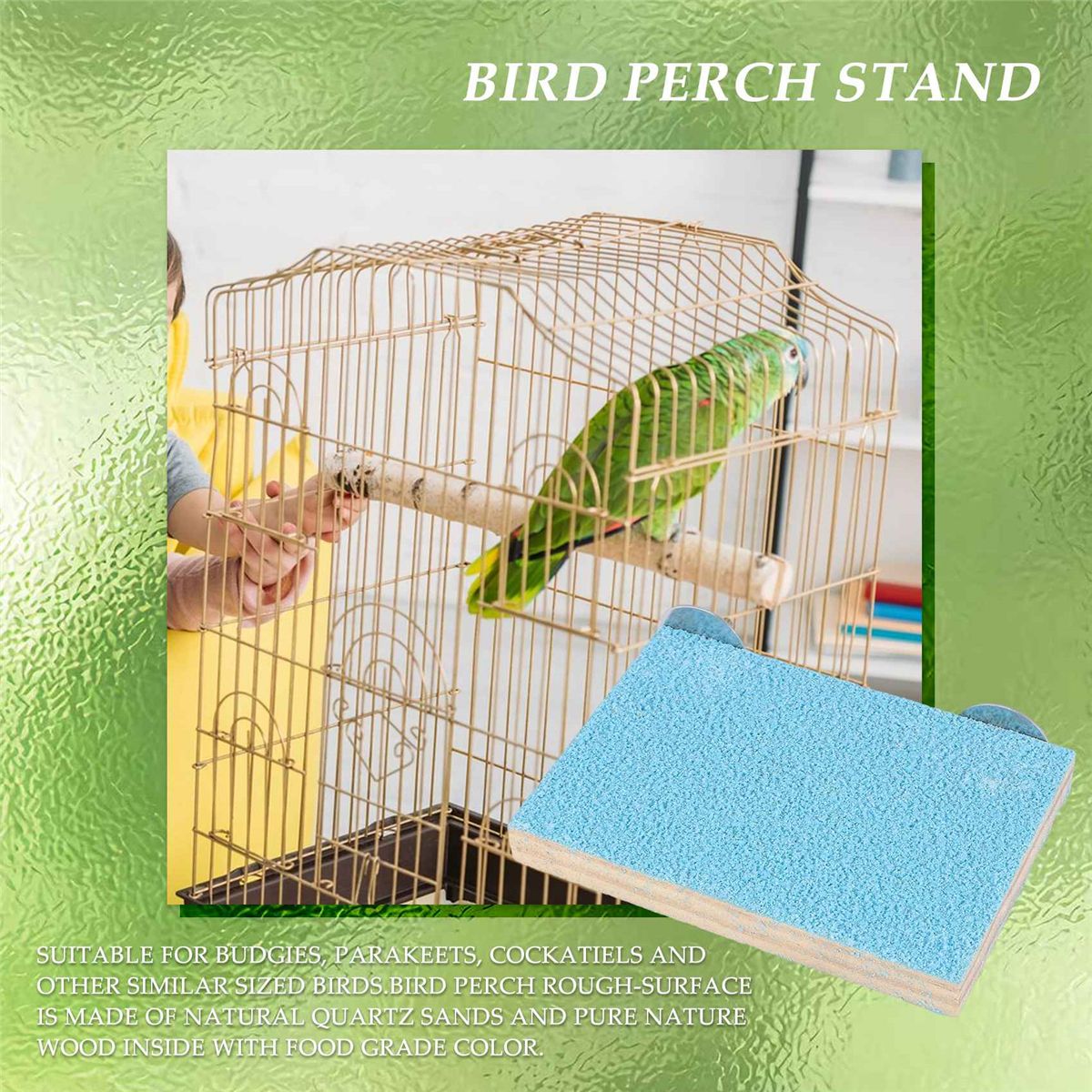 Suitable for budgies, parakeets, cockatiels and other similar sized birds.Bird perch rough-surface is made of natural quartz sands and pure nature wood inside with food grade color.