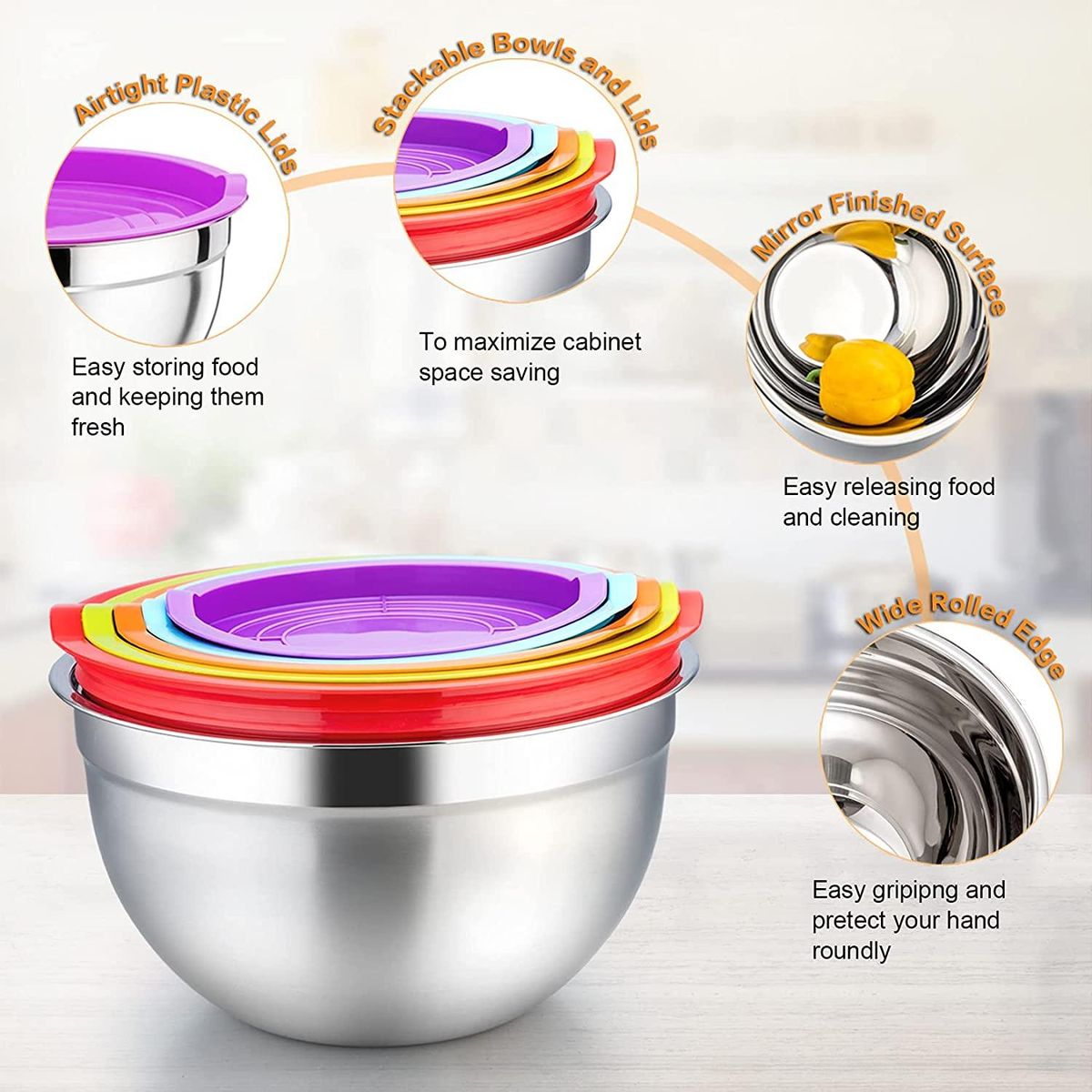 [FINE DESIGN]Have a seal design to keep your food fresh and dry, Smooth and wide rim without sharp angles, Provide comfortable grip experience and protect your hand roundly when taking and washing, Flat base always keep its stability while whisking and mixing.