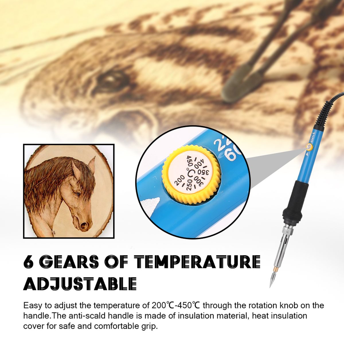 6 gears of temperature adjustable, easy to adjust the temperature of 200℃-450℃ through the rotation knob on the handle.