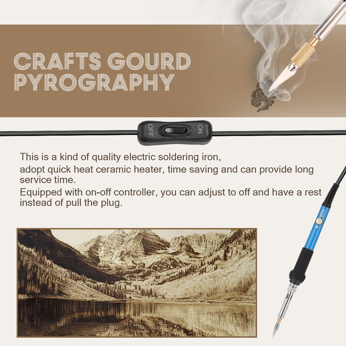 This is a kind of quality electric soldering iron set, the electric soldering iron is adopts quick heat ceramic heater, time saving and can provide long service time. 6 gears of temperature adjustable, easy to adjust the temperature of 200℃-450℃ through the rotation knob on the handle. Equipped with on-off controller, you can adjust to off and have a rest instead of pull the plug. You can have a try.