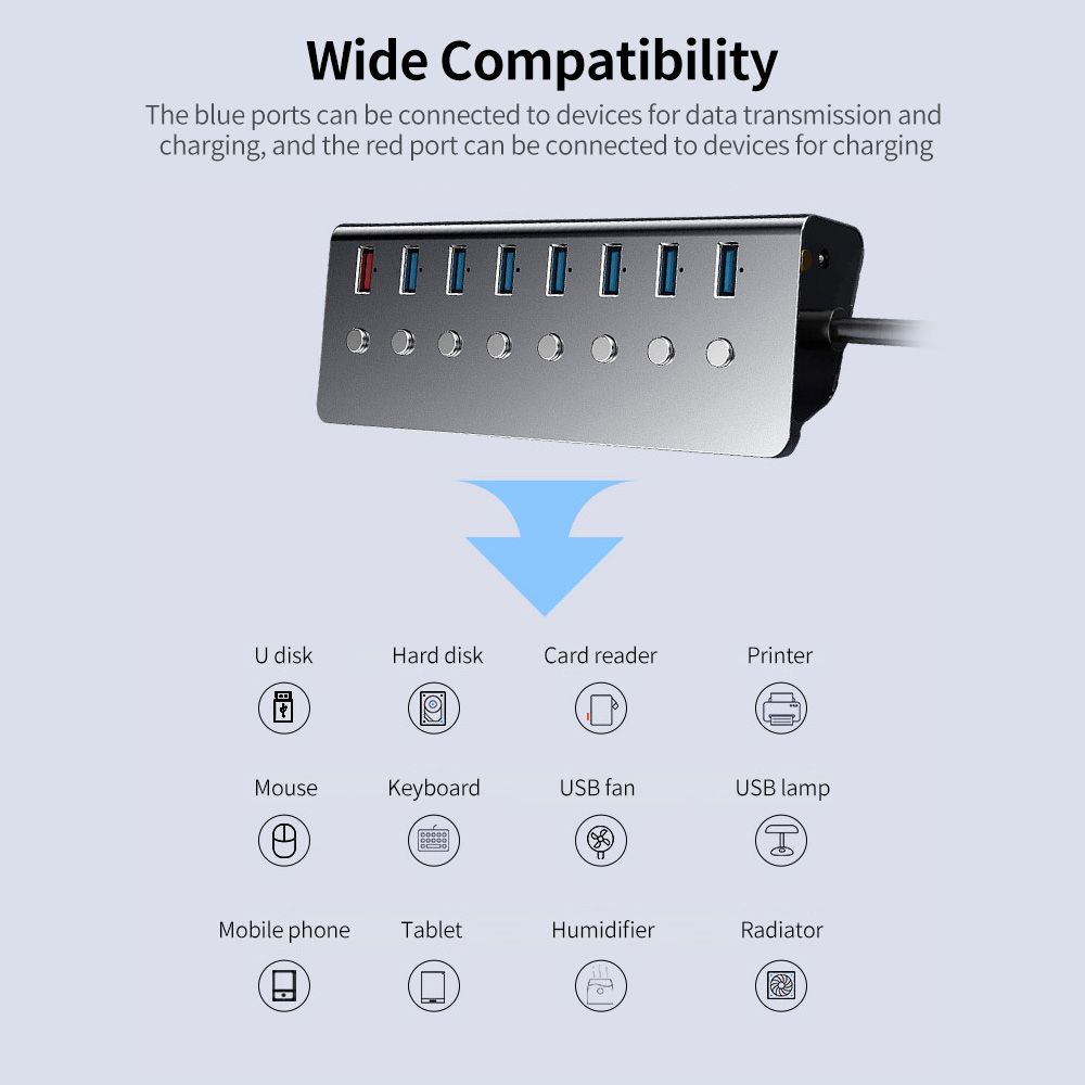 Widely compatible with USB mouse, USB keyboard, U disk, card reader, hard disk, printer, USB fan, USB lamp, mobile phone, tablet, USB radiator, etc.
