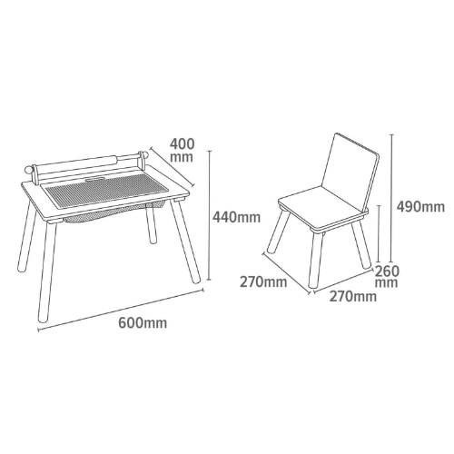 Table: H44 X W60 x D40cmChair: H49 x W27 x D27cmSeat Height: 26cmAssembly: Self Assembly - full instructions providedMaterial: WoodPaper Roll: Supplied with Paper Roll