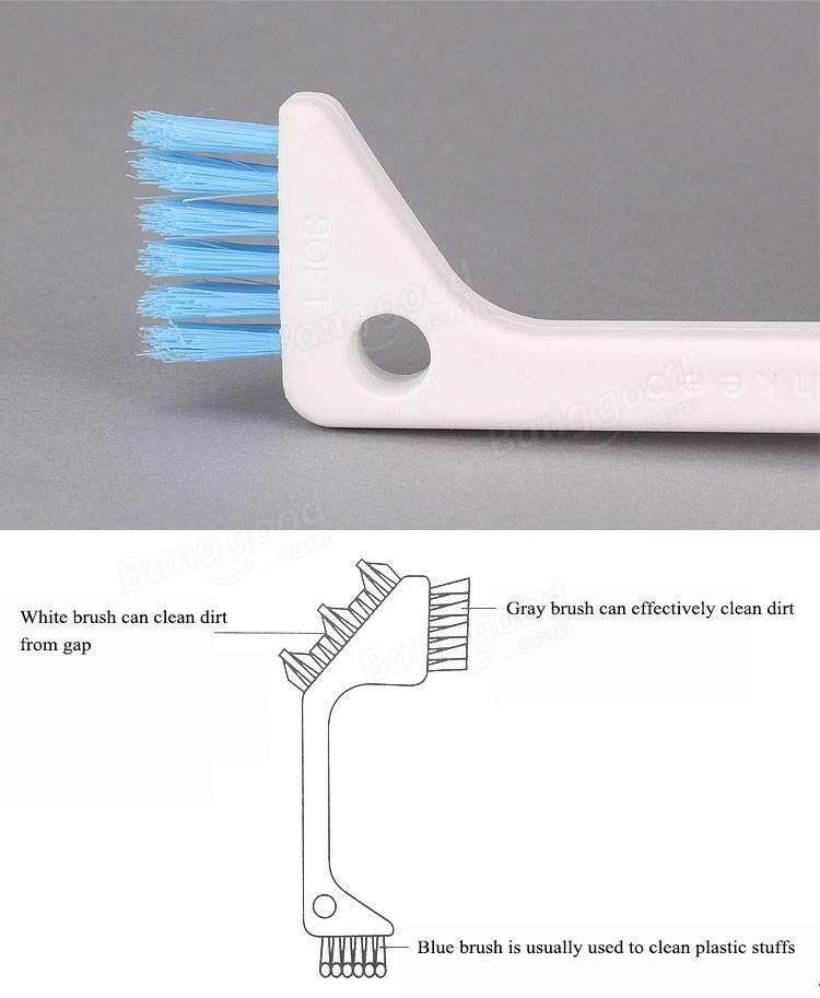 Three kind of brush bristle, gray brush can effectively clean dirt, white brush can clean dirt from . Blue brush is usually used to clean plastic stuffs.